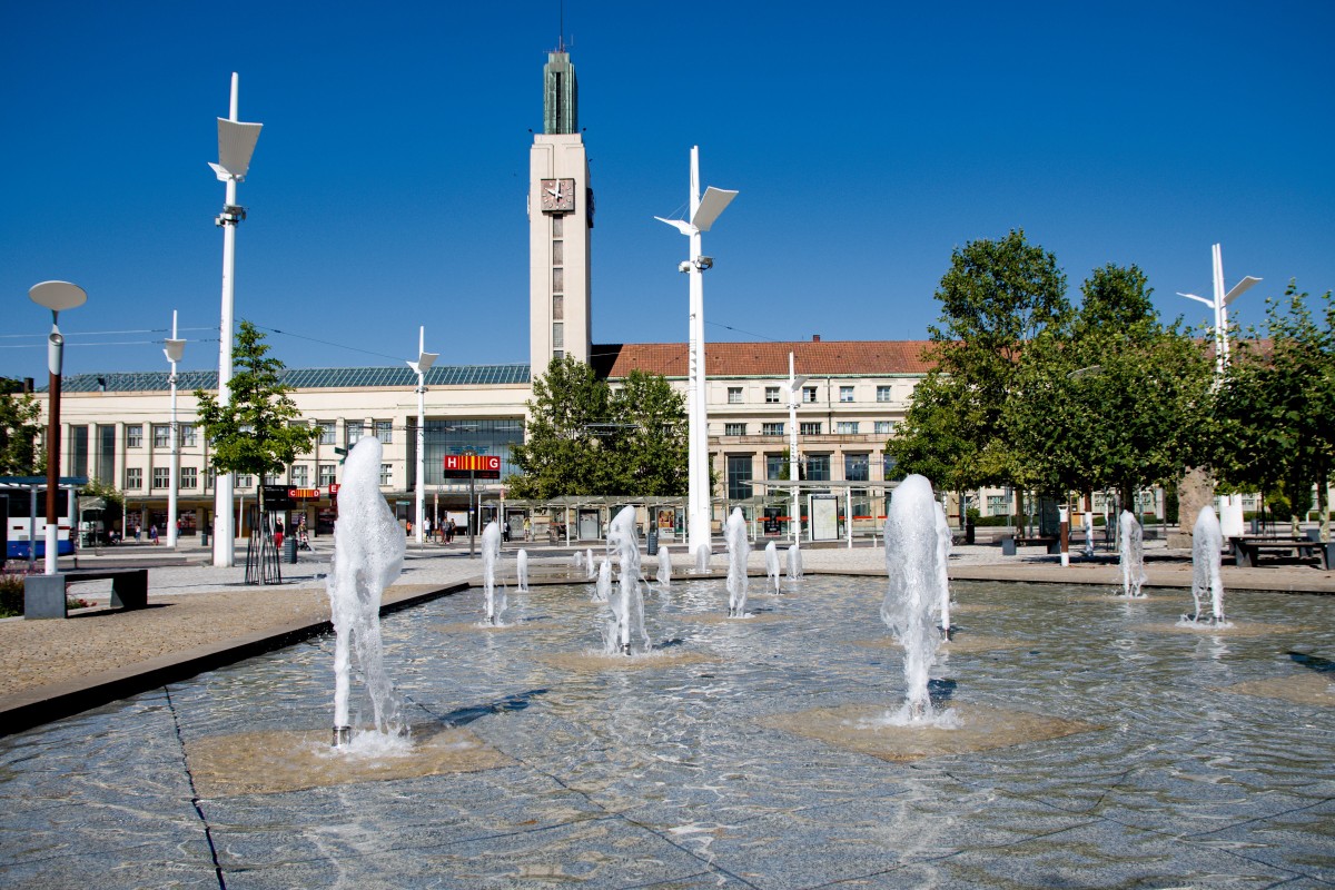 Současně byl nově a vkusně upraven velký prostor před vlakovým nádražím. Uprostřed je koridor určený pro MHD, na zbývající části náměstí byly vysázeny skupiny mladých platanů, které vytvářejí v horkých dnech příjemný stín. Je zde i velký prostor na zaparkování kol, pár laviček pro spočinutí čekajících i plocha s malými vodotrysky, která v létě láká k dovádění zejména malé děti.