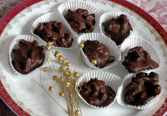 Připravíme si plech na pečení, který vyložíme alobalem. V hrnku nad párou rozpustíme čokoládovou polevu (nebo 3 čokolády na vaření, k nim přidáme trochu ztuženého tuku a trochu moučkového cukru). Mícháme. Jakmile je poleva hladká, přimícháme do ní připravenou směs. Nabíráme ji malou lžičkou a na plech vytváříme co nejpravidelnější kopečky. Necháme v chladu ztuhnout. Pak sloupneme alobal a meruňkové kopečky vložíme do papírových košíčků.