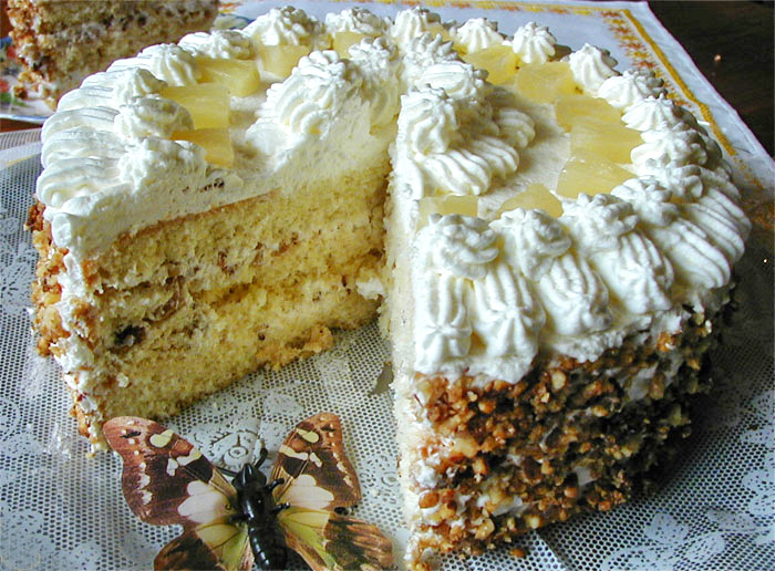 Smetanu ke šlehání se ztužovači ušleháme, dvě třetiny odložíme stranou a do jedné třetiny vmícháme asi třetinu připraveného krokantu. Touto směsí šlehačky a krokantu spojíme jednotlivé části dortového korpusu. Poté naneseme širokým nožem šlehačku na boční strany dortového korpusu a uhladíme. Dortový korpus vezmeme do rukou na nenatřené vrchní a spodní části a jeho svislé okraje postupně „namáčíme“ v připraveném krokantu. Boční strany se tak postupně krokantem obalí. Poté natřeme krém i na vrchní stranu dortu, uhladíme a zdobíme ananasem a zbylou šlehačkou.