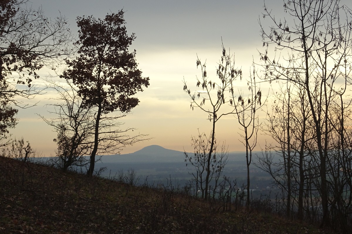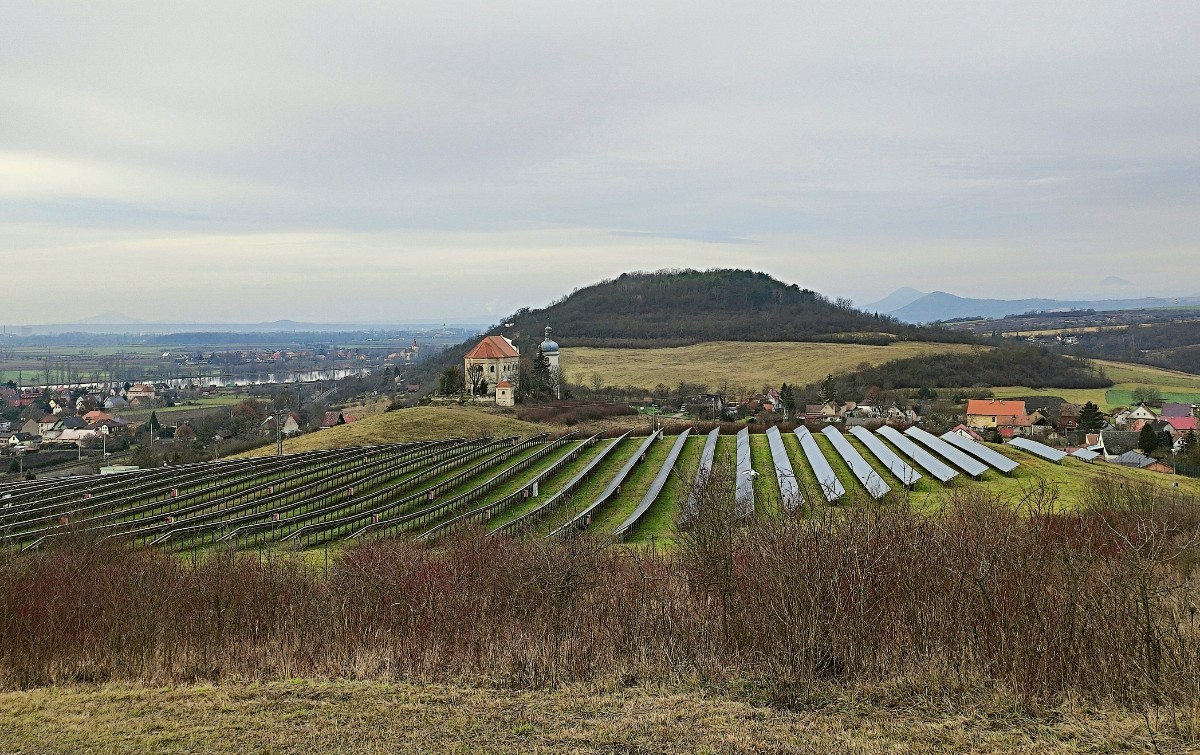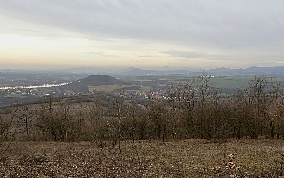Od kostela na východ je vidět fotovoltaická elektrárna a za ní se zvedá hlavní cíl mého výletu - Holý vrch. Se svou výškou 302 m nejde o žádný významný kopec, ale spíš o procházku trochu do kopce. Ačkoliv vrch se jmenuje Holý, z velké části ho pokrývá les. Cesta byla pěkně blátivá a jen jsem bezmocně sledovala, jak se mi boty obalují a těžknou. Na první vyvýšenině je posezení s lavičkami a výhledem na kostel, vrch Křemín za ním a vzdálené České středohoří. Viditelnost bohužel nebyla valná a kopečky se daly v oparu spíš jen tušit. Poseděla jsem a poté došla na vrchol s výhledem i k domovu na Říp.