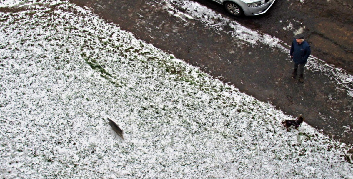Možná se zeptáte, proč je rychlost důležitá? Myslím, že pokud si tohle přečtete, tak to pochopíte. Ano, za hodinu bylo skoro po sněhu, zbylo ho trochu na kopci a za domem mezi stromy. Když tohle píšu je venku tmavo a nevlídno, psa by nevyhnal. Když se zmiňuji o psovi, mezi fotkami je jedna s manželem, pejskem a ta čára ve sněhu je toulavý kocour, který denně doprovází našeho Boonečka s pánečkem na jejich procházce. Říkám mu Macík, nikomu nepatří, trochu se o něj stará sousedka bydlící v suterénu. Když jdu s pejskem já, tak sice vyleze, ale pozoruje nás z větší vzdálenosti.