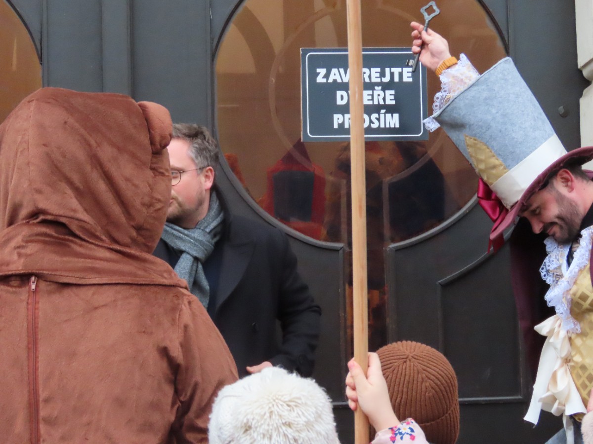 V pátek odpoledne se před vraty roudnické radnice shromáždil dav lidí a lidiček v maskách a dožadoval se hlasitě vydání klíče a s ním i moci nad městem. Po chvíli se vrata opravdu otevřela a místostarosta trochu váhavě klíč vydal.