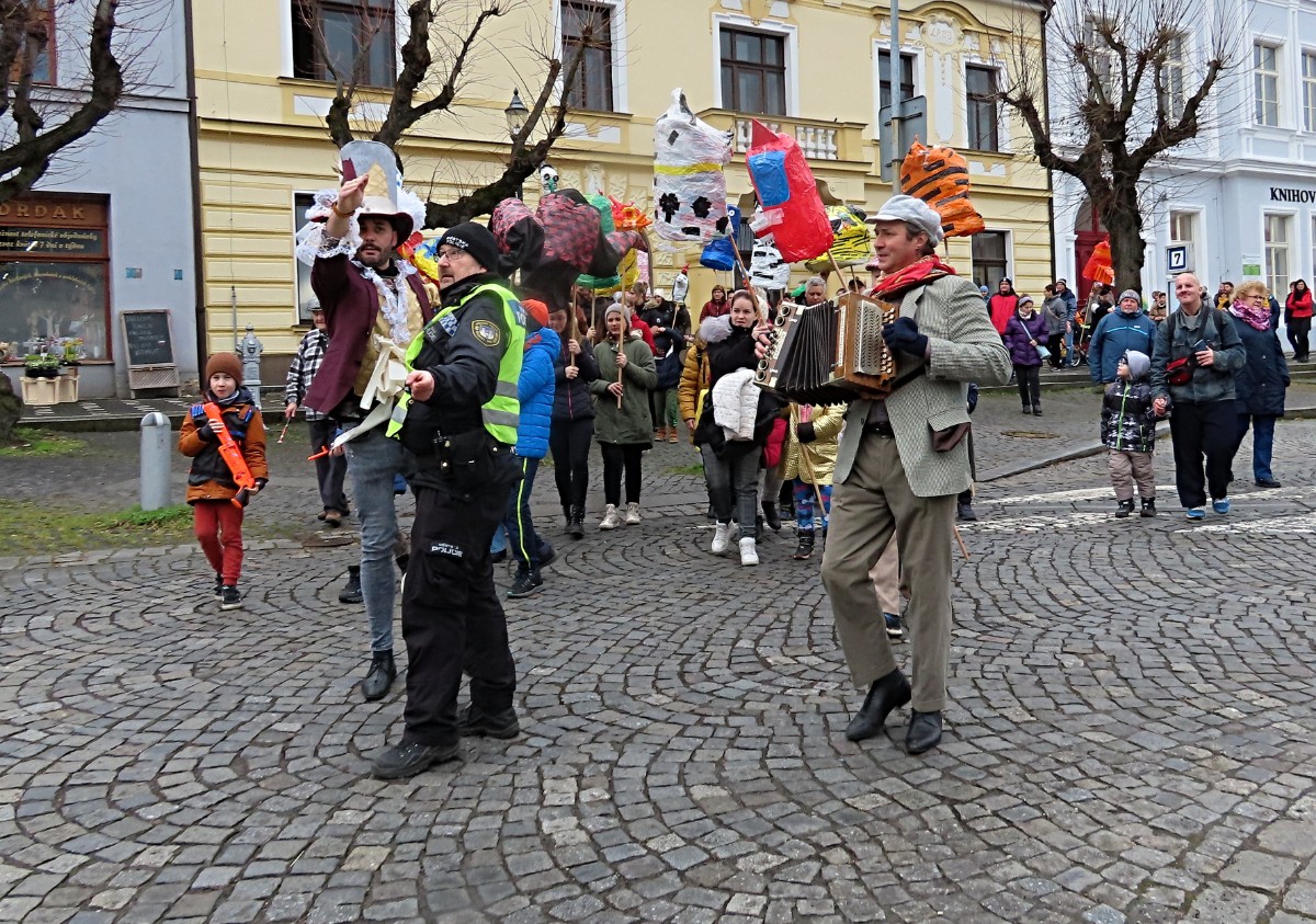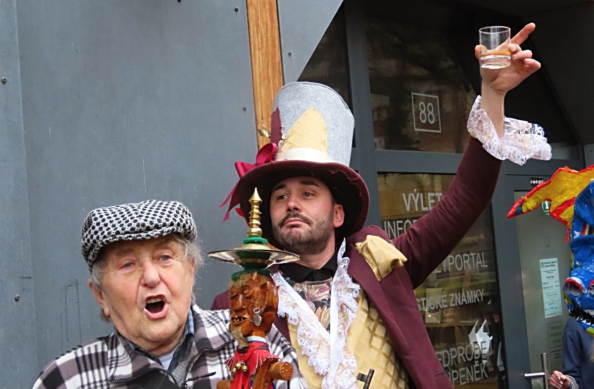 Tímto okamžikem převzala vládu veselá kumpanie roztodivných masek a průvod, doprovázený podřipským harmonikářem a jeho druhy, se vydal na obchůzku náměstí.