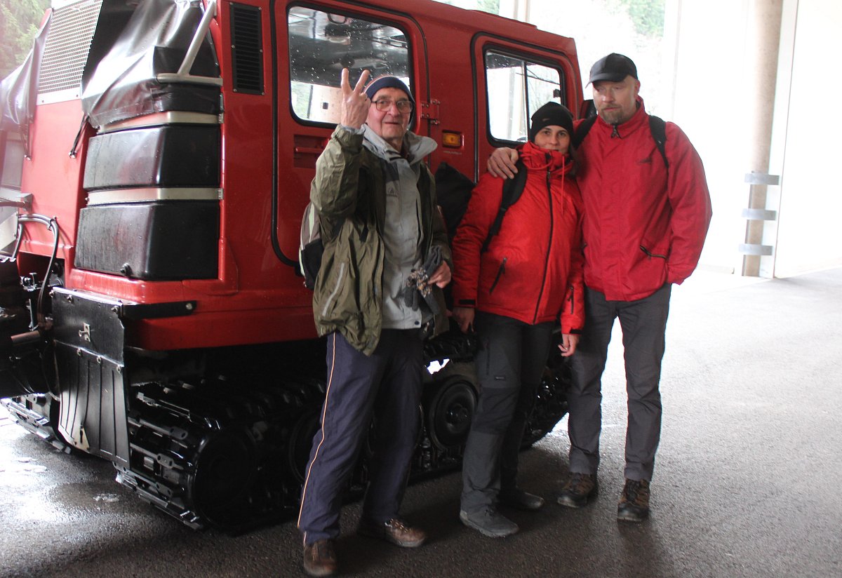 Po cestě se počasí střídalo, hned se přihnala silná dešťová přeháňka a vzápětí vykouklo sluničko. V Peci pod Sněžkou nás uvítal hustý liják, což nám na náladě moc nepřidalo. Přesto jsme se vydali směrem k lanovce na Sněžku. Tam jsme zjistili, že lanovka kvůli větru jezdí jen do poloviny cesty na Růžovou horu. V sedm hodin ráno na Sněžce udeřil orkán. Nezbývalo nám, než potvrdit dopravu na Luční boudu sněžnou rolbou. Čekání na spoj jsme si zpříjemnili posezením v Hospůdce na peci. Protože už nám bylo smutno po domově, dali jsme si moravského vrabce se zelím a bramborovým knedlíkem. Po obědě dokonce vykouklo i sluníčko. Auto jsme zaparkovali v takovém betonovém parkovacím domě, kde jsem se i docela bála. Doposud jsem takový znala jen z detektivek, a tam se po sobě mezi auty vždy střílelo. Pan řidič rolby byl trošku otrávený životem, říkal, že nahoře už pár dní není vidět ani na krok. Hodinová cesta rolbou k Luční boudě, to byl zážitek na celý život.