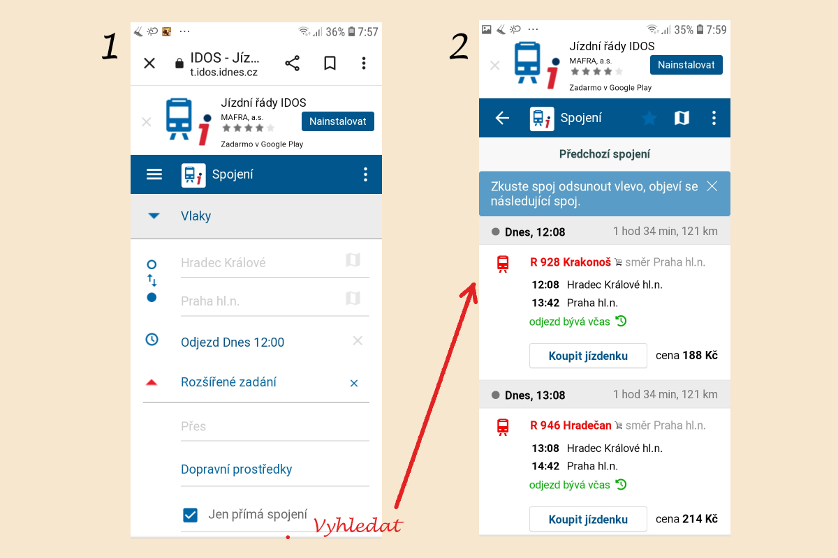 Na výchozí obrazovce (1) musíte zadat odkud kam jedete, tedy výchozí místo a cílově místo. Dále datum cesty a hodí se zadat i nějaký předpokládaný čas odjezdu. Pod tímto zadáním je možnost si zaškrtnout “Pouze přímá spojení”. To je docela výhodné, pokud chcete jet přímo a takové spojení v realitě existuje. Já si tímto zaškrtnutím eliminuji spojení z Hradce přes Pardubice do Prahy, protože v Pardubicích bych musela přesedat. Další možností je použít tzv. “Rozšířené hledání”, kde máte možnost si svou trasu podrobněji naznačit. Například si zadáte některá důležitá místa na trase, místa přestupů, druhy vlaků apod. Doporučuji si tuto fázi několikrát vyzkoušet na nečisto, pochopíte, jak způsob vyhledávání funguje. Nabídnou se vám první tři spojení (2), která odpovídají vašemu zadání. Pokud vám tato spojení nevyhovují, můžete použít tlačítko “Dřívější spojení” nebo “Pozdější spojení” (na PC) nebo "odsunout spoj vlevo" (na mobilu) a objeví se vám další spojení. Nebo se vrátit na původní výchozí místo a zadání změnit. Bát se toho nijak nemusíte. Pokud nemáte zaplaceno, můžete hledání kdykoliv ukončit nebo se vrátit o krok či více kroků zpět.