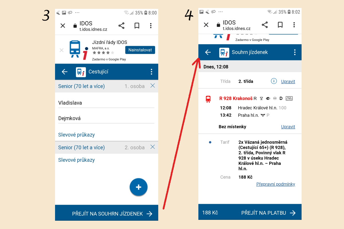 Pokud jste si vybrali konkrétní spojení, můžete si o něm zjistit poklikáním na jednotlivé údaje řadu dalších informací. Např. kudy vlak jede, délku cesty v kilometrech i hodinách a také základní cenu jízdenky. Klepnutím na tlačítko "Koupit jízdenku" se dostanete k zadání cestujících (3). Musíte zadat svůj své jméno a příjmení, elektronická jízdenka je totiž na jméno. Cestujete-li společně s někým, můžete si ho na jízdenku přidat pomocí tlačítka “Pŕidat další cestující”. U každého z cestujících si můžete zadat i slevu výběrem z celé sady možných slev. Na obrázku 3 je sleva na oba seniory již zadaná. Po těchto zadáních se vám automaticky přepočítá celková cena jízdenky. Dál se dostanete po kliknutí na tlačítko "Přejít na souhrn jízdenek".