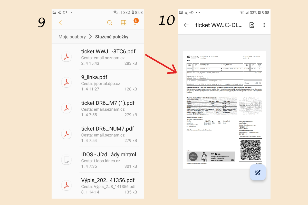 Průvodčímu se prokazujete buď papírovou formou jízdenky nebo zobrazením zaslané elektronické jízdenky v mobilu. Já se ke stažené jízdence ve svém mobilu typu “Samsung” dostanu přes aplikace Samsung - Moje soubory - Stažené položky - výběr jízdenky ze seznamu - zobrazení. Každému však doporučuji, aby si to na svém mobilu v klidu vyzkoušel. V obou případech průvodčího zajímá hlavně QR kód, který si při kontrole jízdenek přečte pomocí svého zaŕízení velikosti cihly, které sebou nosí místo/kromě půvabných kleštiček.