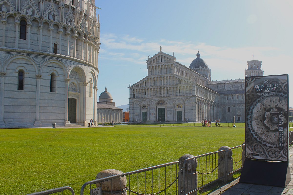 Na místě jsme byli mezi prvními. Pohled na bílé stavby uprostřed udržovaného zeleného trávníku byl úchvatný. Měla jsem představu, že tam někde stojí jedna opuštěná šikmá věž, ale ona byla obklopena krásnými mramorovými stavbami. Celkem jsou na jednom místě čtyři. Tomuto místu se říká "Pole zázraků". Nejprve jsme si prohlédli Baptisterium sv. Jana Křtitele, které měří na výšku 55 metrů. Stavba postavená již ve 12. století je obložena bílým mramorem a zdobená mnoha různými sochami.Samotná střecha, která připomíná citron, byla dostavěna až o dvě století později. Další památkou je hřbitov Camposanto Monumentale, nejkrásnější pohřebiště na světě. Dominantou je Katedrála Nanebevzetí Panny Marie, nejstarší budova z uvedených, která se začala stavět již v roce 1064. Tuto stavbu bohužel zastiňuje ona vyhlášená šikmá věž. Když jsme dokončili prohlídku chrámu, stačili prostranství mezi památkami zaplnit návštěvníci z celého světa. Počasí se vydařilo a snad každý se chtěl zvěčnit na památku před posledním divem, před šikmou věží. Tato osmipatrová stavba byla postavena na písečném podloží a krátce před dokončením už se začala naklánět. Celé generace stavitelů se snaží památku zabezpečit před zřícením.