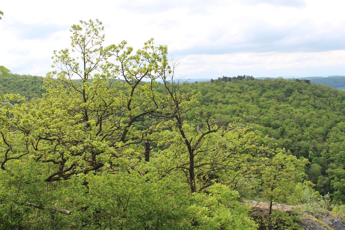 Cesta nahoru byla ze začátku až ke kapličce docela příjemná, pod vrcholem přišlo prudné stoupání. Nikam jsme nepospíchali a s malými přestávkami jsme nakonec dorazili až ke kříži. Nahoře nás čekaly nádherné výhledy do okolní krajiny a samozřejmě i na budovy pod námi. Z našich kamarádů dole byli jen takoví malí mravenečkové.