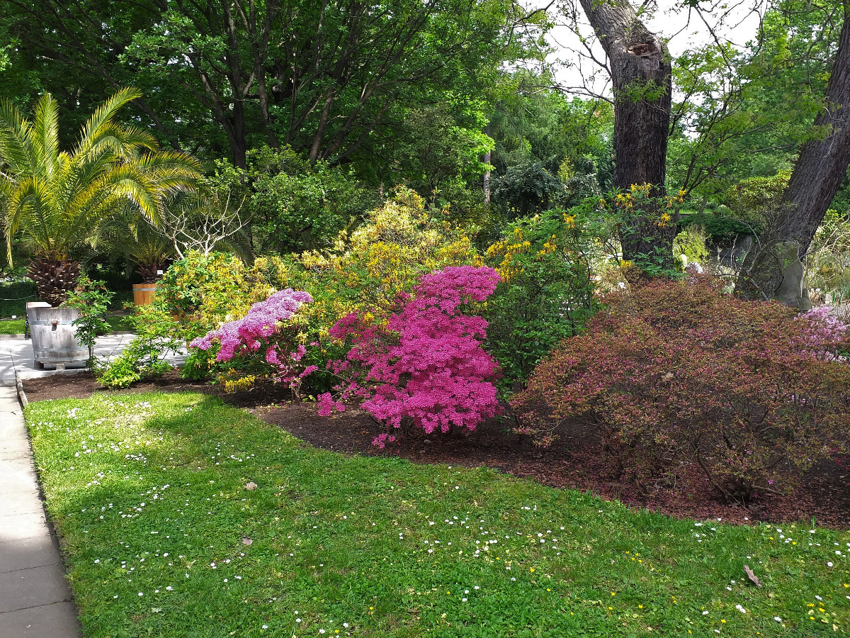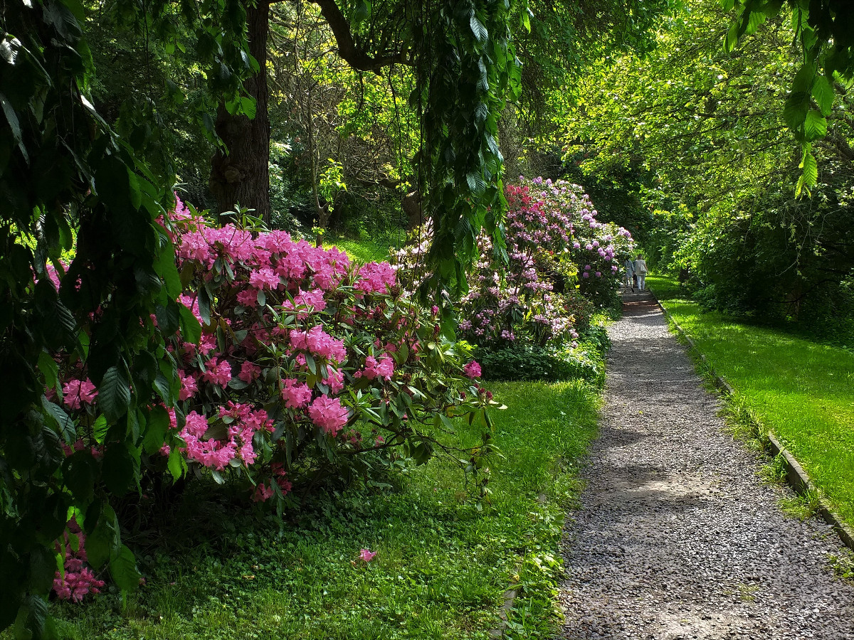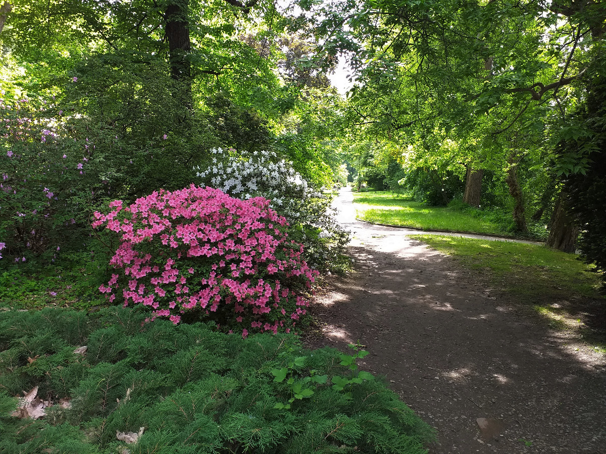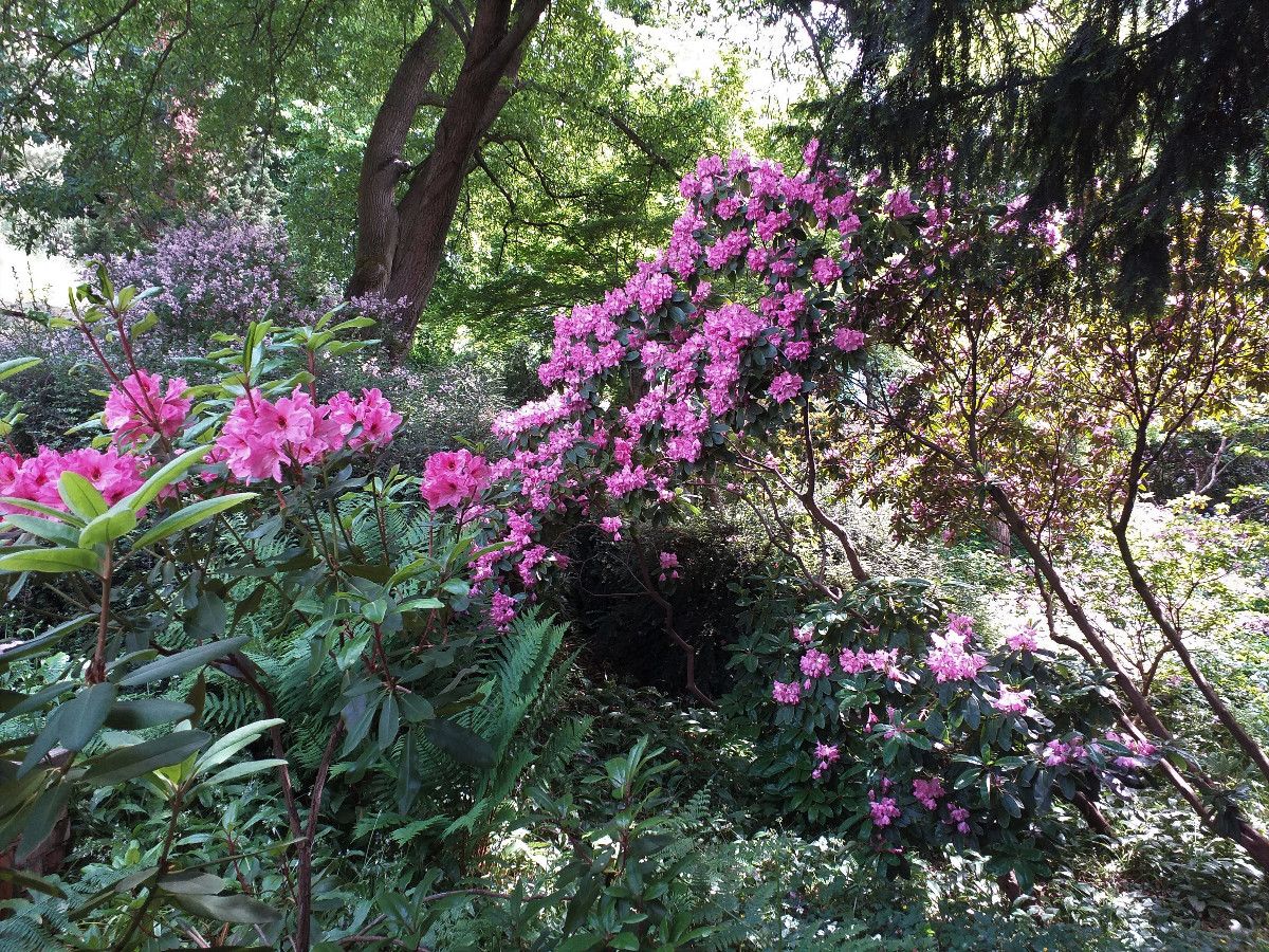 Několik rododendronů u našeho jezírka je jen chabou ochutnávkou přehlídky velkorysého květenství v městských sadech a zahradách.