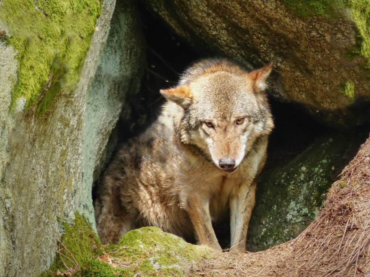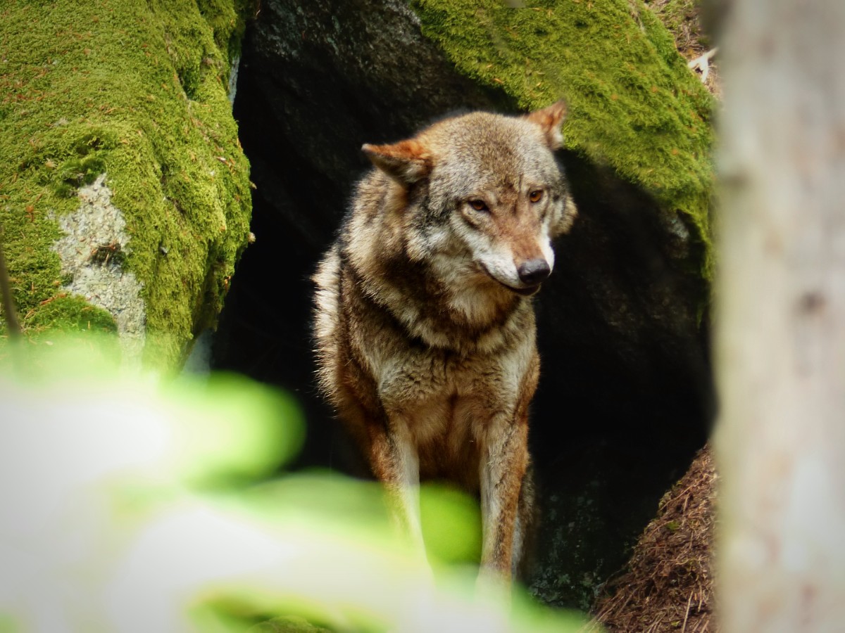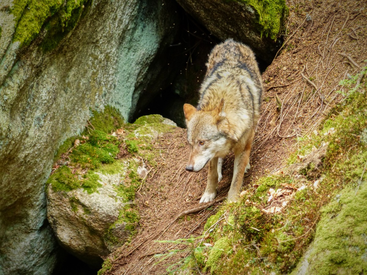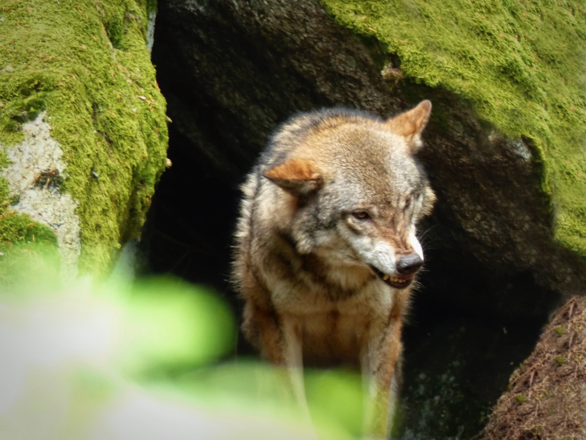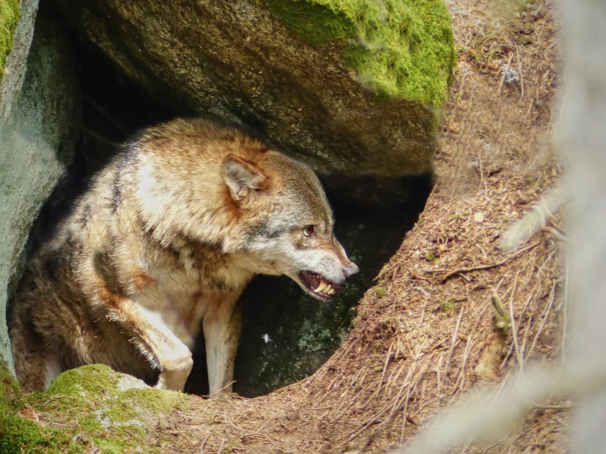 Měli jsme velké štěstí, že na stráni nad námi vykoukl jeden vlk ze skalního úkrytu a druhý byl schovaný za stromem. Cvakala jsem foťákem co to šlo, protože za chvíli oba seběhli pod lávkou na druhou stranu a tam nám zmizeli mezi stromy. A už jsme jim viděli jenom hřbety. Ještě jsme dobu čekali, jestli se ještě ukážou, ale marně. V současné době je ve výběhu devět zvířat. Bylo to krásný setkání. Moc fotek se mi nepodařilo vybrat.