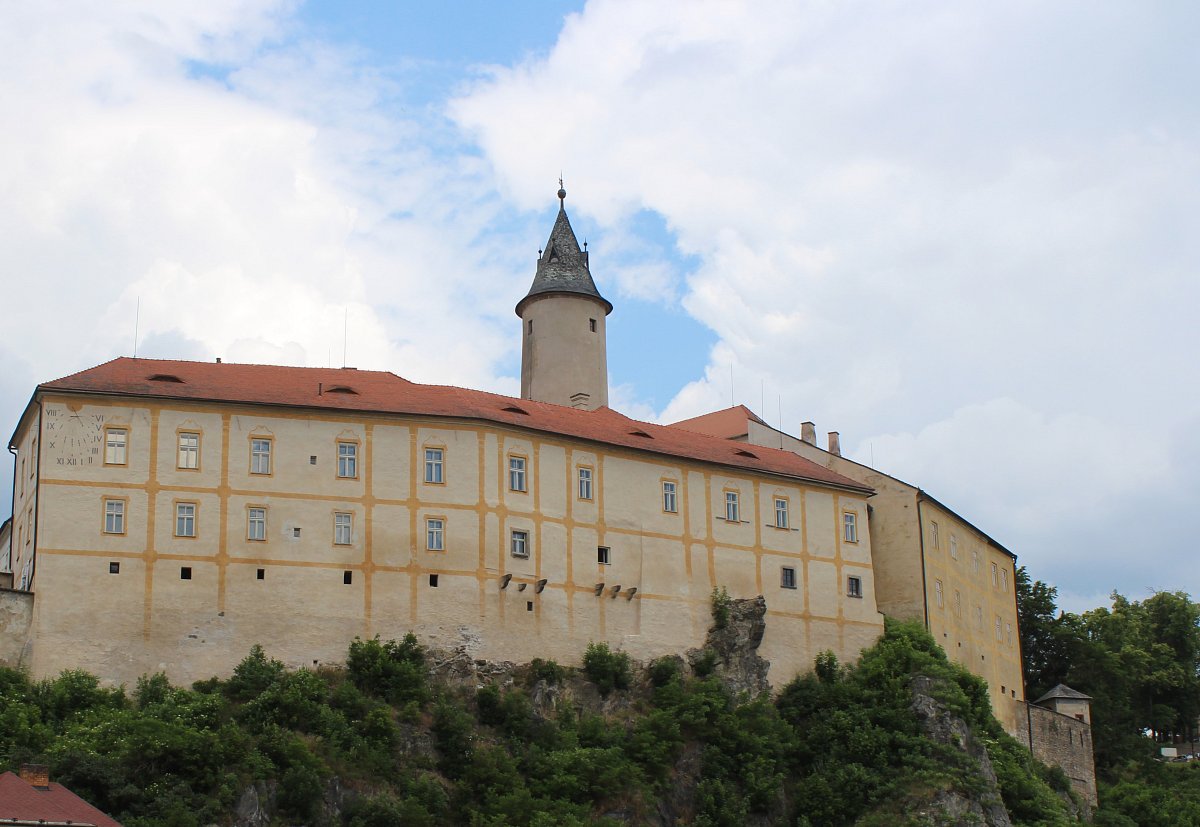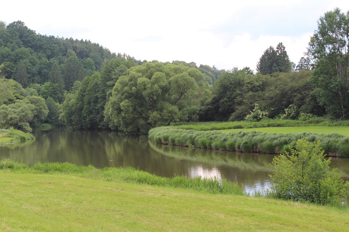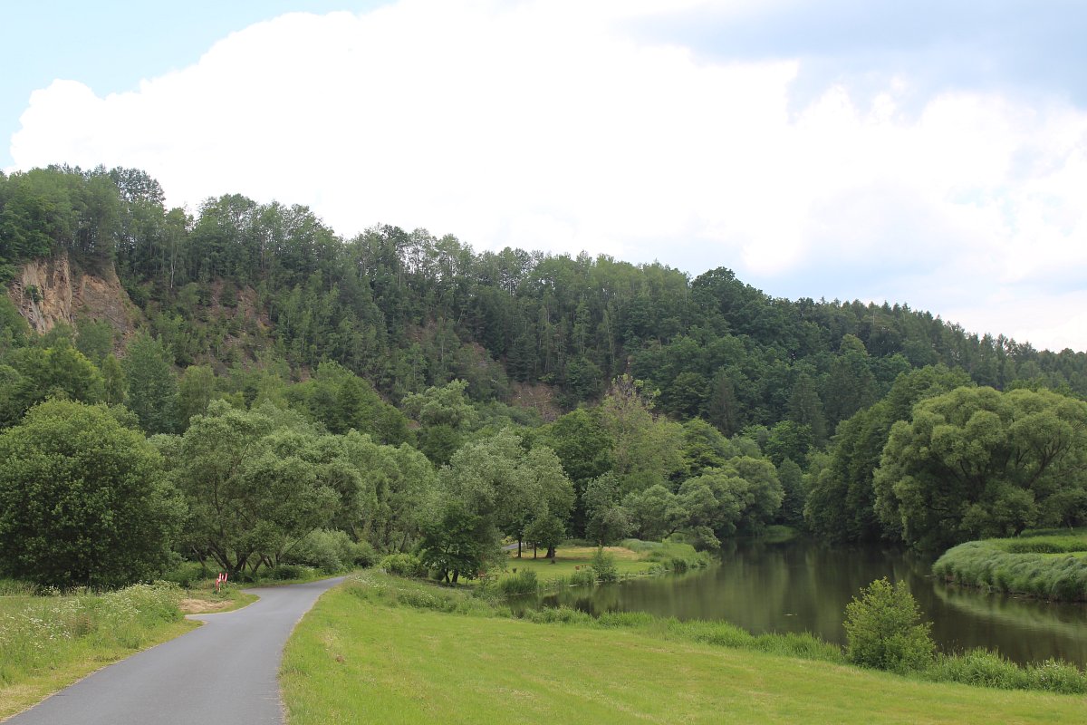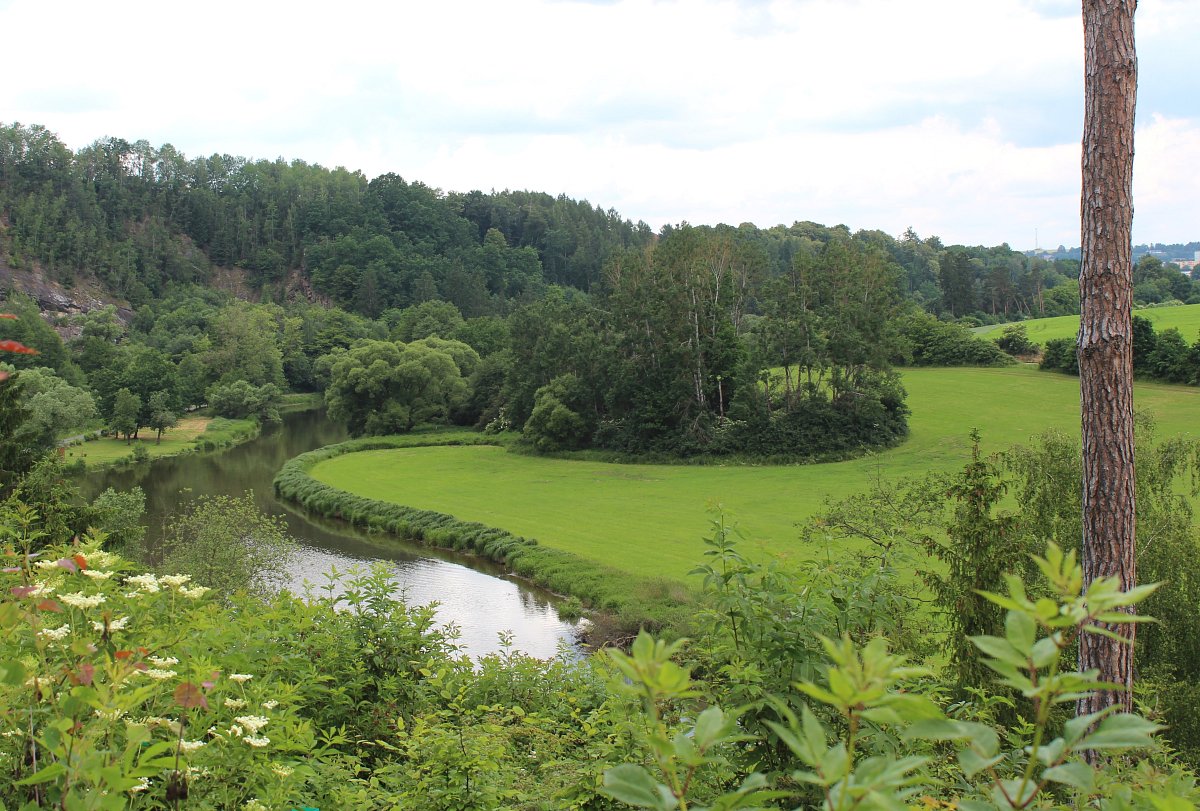 Byl horký skoro letní den, a tak jsme napřed uhasili žízeň v místní letní hospůdce, a posíleni jsme vyrazili směr Ledeč nad Sázavou. Cesta kopírovala meandry řeky i skály v lese. Krajina nám nebyla úplně neznámá. Před 33 lety jsme na toto místo vezli naši dceru, která zde pobývala na letním vodáckém táboře. Ráda vzpomíná, hlavně na poslední rozlučkový večer, který jim vedoucí připravili na nádvoří zámku v Ledči.