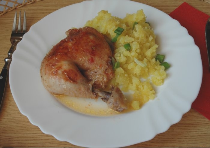 Kuře opláchneme, osušíme, rozporcujeme. Každý díl masa osolíme a potřeme všude sladkou chilli omáčkou na kuře. Dobře se to dělá mašlovačkou. Vložíme do pekáčku či zapékací misky, kam jsme na dno položili dva až tři tenké plátky másla. Přiklopíme pokličkou a pečeme v troubě. Ke konci pečení vyjmeme a ještě jednou po povrchu kuřecí porce potřeme. Necháme v troubě ještě chvíli odkryté, aby se vytvořila křupavá kůrčička. Podáváme třeba s rýží nebo se šťouchanými brambory. Vhodným doplňkem je hlávkový nebo okurkový salát.