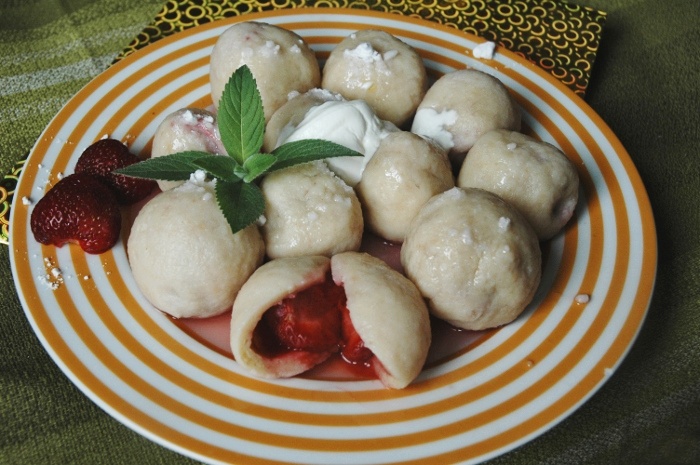 Nejdříve si připravíme ovoce - očistíme, opláchneme a necháme oschnout. Pokud by zůstalo vlhké, špatně by se do knedlíků balilo. Z tvarohu, vajec, mouky a jemné strouhanky uhněteme hladké těsto - mělo by být středně tuhé, aby se s ním dobře pracovalo. Množství mouky je závislé na druhu tvarohu, začínáme na 150 g a podle potřeby přidáváme. Těsto rozválíme na pomoučené vále, rozkrájíme na čtverečky a do každého čtverečku zabalíme kousek ovoce. Pomoučenýma rukama v dlani tvarujeme menší knedlíky. Vkládáme je do vařící vody, vařečkou je lehce oddělíme ode dna a vaříme je krátce podle velikosti knedlíků. Jahodové z větší jahody se vaří asi 7 minut od chvíle, kdy se voda po vložení knedlíků začne znovu vařit. Vyjmeme je děrovanou naběračkou a na talíři je vidličkou propícháme, aby z nich vyšla pára. Můžeme je posypat cukrem, nastrouhaným tvrdým tvarohem a zakapat rozpušteným. Nebo je můžeme polít zakysanou smetanou, ve které jsme rozmačkali několik jahod a pocukrovat. Nebo posypeme třeba na másle opečenou strouhankou.