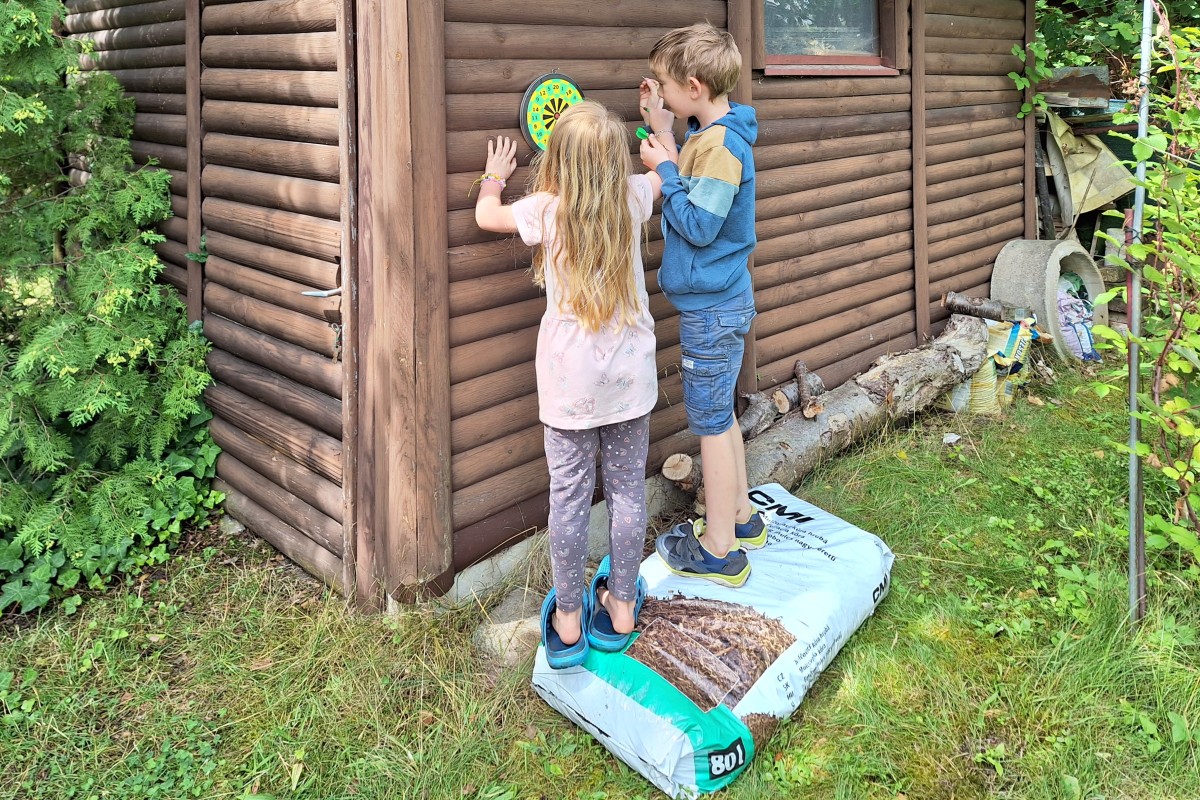Zahrada u chaty se během během týdne proměnila v hernu kombinovanou s tělocvičnou. Prostředkem trávníku byla natažená šňůra, přes kterou se hrál líný tenis nebo badmintom. Vnuk mě nazval svým nejlepším parťákem, na což jsem byla patřičně hrdá. Vnučka provaz jednou přehlédla a vyrobila si ošklivou odřeninu na krku (večer jsme na ni pŕikládali chladivé obklady). Na stěně dřevníku děti umístily terč a soutěžily v šipkách (naštěstí žádná zranění). Tady se zase osvědčila dědova pevná ruka. Všichni jsme se dohadovali u petanque a přeměřovali umístění našich koulí. Ti nejznavenější chvílemi odpočívali na polštářích v plážovém stanu. Nejoblíbenější činností ale bylo večerní zalévání zahrady hadicí. Než vypuklo, děti musely sundat trička i boty. Dokonale dokázaly nejen zalít všechny záhony, ale i zmáchat samy sebe.
