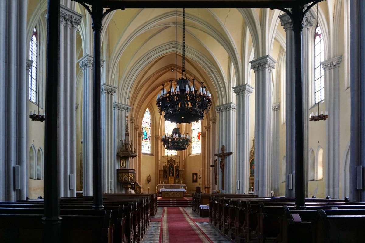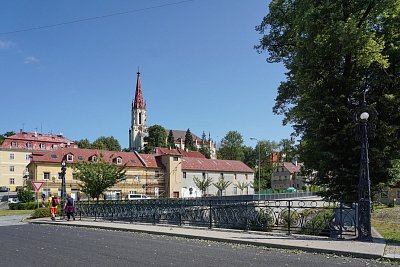 Od řeky jsme zamířili k další dominantě města. Štíhlá věž kostela sv. Vavřince byla vidět už z dálky, ale loď se ztrácela za okolními domy a stromovím. Kostel na tomto místě stál zřejmě již ve 14. století. Byl však mnohokrát přestavován. Současná pseudogotická podoba je výsledkem rozsáhlé přestavby na konci 19. století. Měli jsme velké štěstí, protože jsme u vchodu potkali velice milou paní, která nám umožnila prohlídku působivých vnitřních prostor.