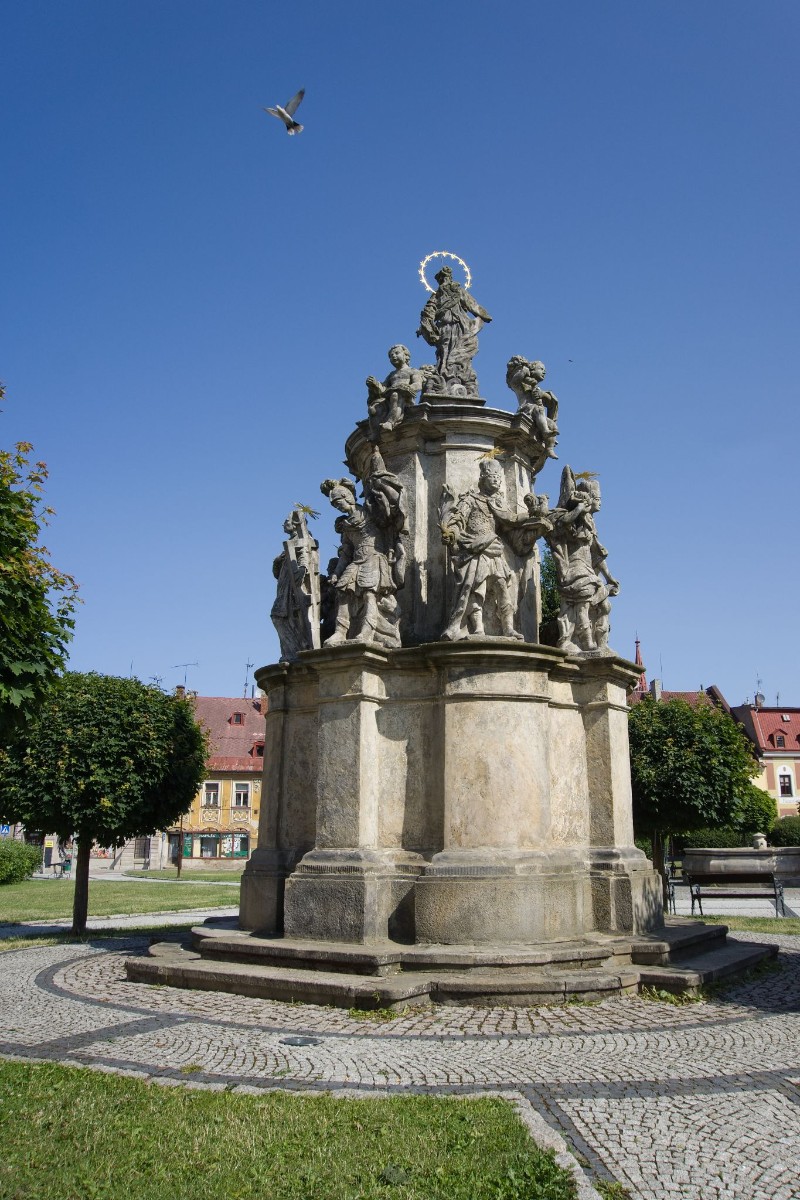 V parku uprostřed náměstí stojí umělecky a historicky nejcennější zdejší památka – barokní mariánské sousoší tzv. morový sloup. Postavu Panny Marie na jeho vrcholu obklopují čtyři sedící andělé. Pod nimi stojí v kruhu osm světců - svatí Václav, Šebestián, Josef, Jan Nepomucký, Antonín Paduánský, Vavřinec, Florian a Vít. Měšťané je nechali zřídit ve 30. letech 18. století. Autorství není doloženo, ale předpokládá se, že je dílem některých žáků Matyáše Bernarda Brauna.