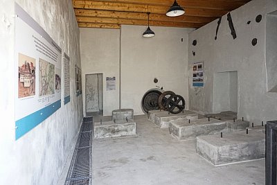 Expozice vodního náhonu a Francisovy turbíny z roku 1927 byla bohužel zrovna zavřená, takže jsme dovnitř jen nahlédli přes zamřížované dveře a přečetli si více o mlýnu, který tu stával, na informační tabuli. Velice pěkně provedené informační tabule jsou ve městě umístěny na všech významných místech. Text je na nich uveden nejen v češtině, ale i v polštině, němčině a angličtině.