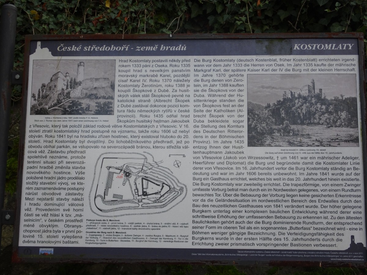 Hrad Kostomlaty, přesněji řečeno to, co z něho zbylo, stojí ve svahu ve stoupání na horu Kloč nad obcí Kostomlaty pod Milešovkou. Gotický hrad patřil rodu Kostomlatských z Vřesovic a opuštěný je už od 16. století, kdy panstvo dalo přednost zámku dole v městečku. V polovině  devatenáctého století tu byla vystavěna hospoda, která zanikla až v padesátých letech století dvacátého. O ruiny hradu pečuje Občanské sdružení pro záchranu hradu Kostomlaty a jeho péče mu svědčí. Zříceninu zabezpečili a v sezóně tu panuje čilý ruch. V provozu je kiosek s občerstvením a vystoupat můžete i na hradní věž, ze které je krásný výhled na České středohoří včetně Milešovky i Krušné hory na západě. Hrad si zahrál v pohádce režiséra Zdeňka Trošky Nejkrásnější hádanka.