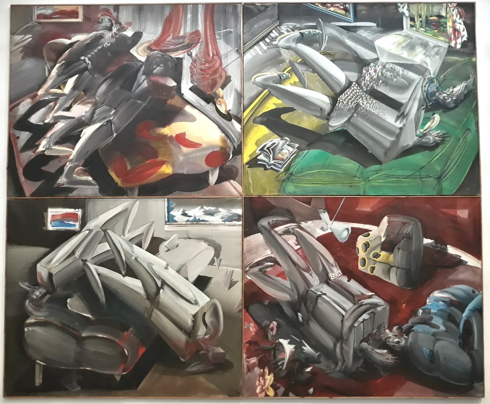 Obrazy jsou rozmístěny ve dvou výstavních sálech muzea v přízemí. V prvním sále lze upozornit na dílo Rok vleže z roku 1986 z majetku Muzea Kampa, které je ještě olejomalbou (podobná díla, ještě olejomalby ze 70. a 80. let minulého století, jsou vyobrazena např. na odkazu www.artlist.cz/michael-rittstein-2371/).