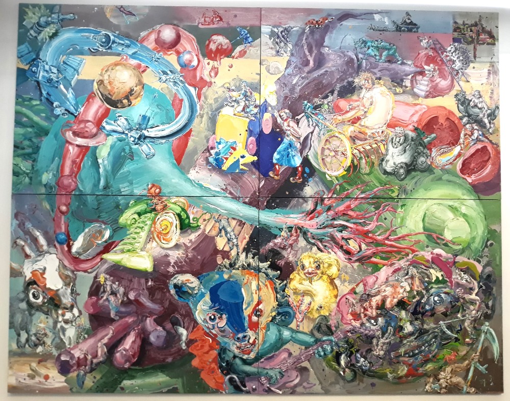 Později totiž přesedlal Rittstein na tvorbu akrylovými barvami, a když v polovině 90. let přešel z expresivního figuralisty v krajináře, ustoupil též od drobnopisné malby a nadšeně se začal koupat ve vrstvách barevné hmoty, kterou lil na plátno rovnou z plechovek a k jejich roztírání používal mimo jiné i smetáky a košťata. Ve druhém sále tak návštěvníka ohromí dvě ohromná díla velikosti 4 x 6 metrů, tj. o plochách 24 m2, které jsou složena (i pro možnost přepravy) vždy ze čtyř dílů 2 x 3 metry (viz druhé a třetí foto za článkem, díla z roku 2022 Genetická zelenina a Dvě klády). Následující fota za článkem dokladují ukázku dalších vystavených děl (v pořadí Údiv a Tlustý malíř) a zakončena jsou posledním fotem, triptychem obrazů z roku 2023 Cestou I + II + III.
