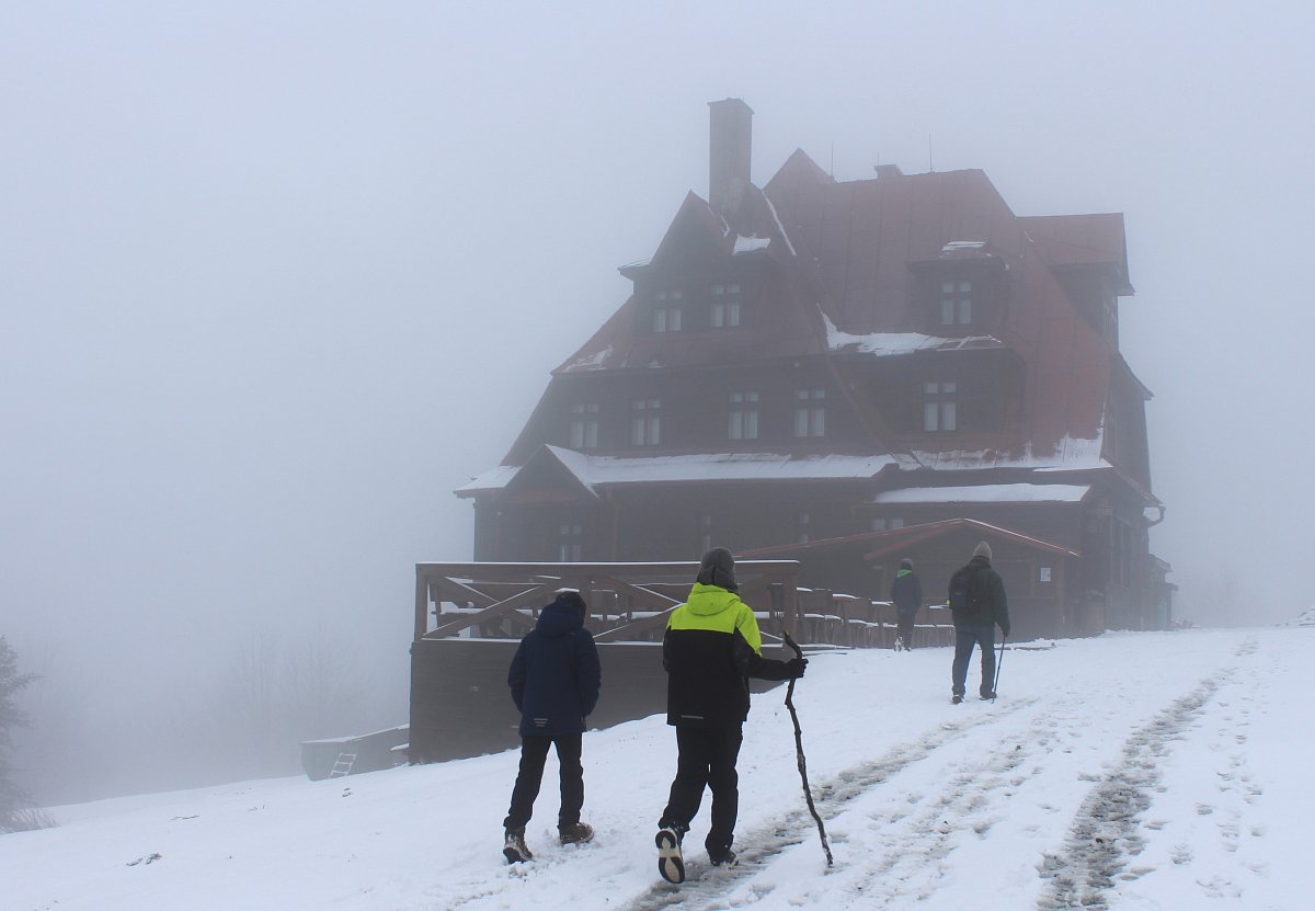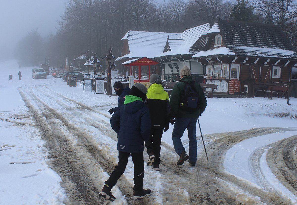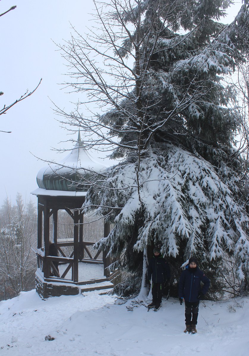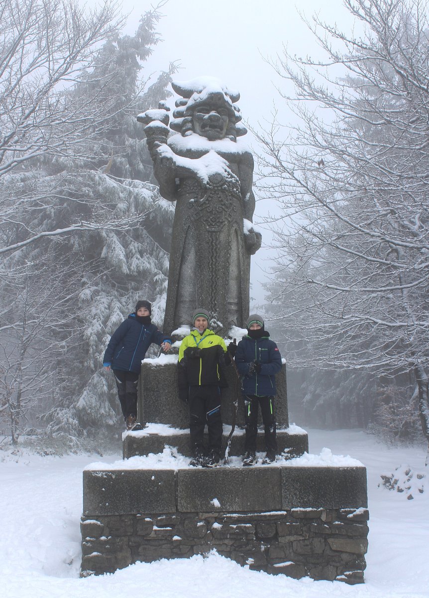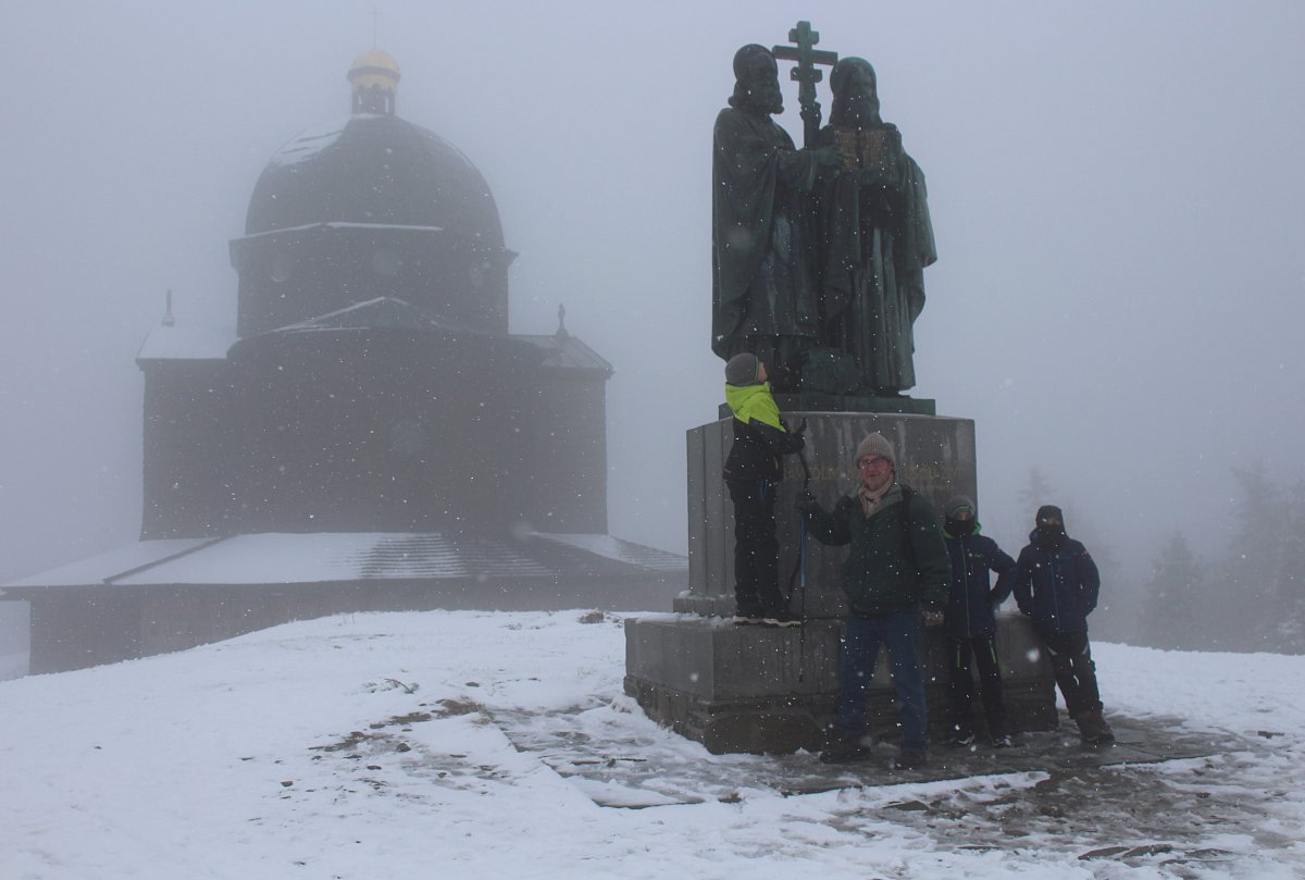 Na druhý den naplánovala babička cestu na Radhošť. Říkala, že se uskuteční za každého počasí, i kdyby trakaře padaly. Nepadaly, ale do rána napadlo asi 8 cm krásného bílého sněhu. Když jsme si připravovali snídani, podařilo se nám vyhodit v celé chatě pojistky teplometem, kterých tam bylo plno. Náš šikovný děda je ale, podle telefonických instrukcí paní majitelky, znovu nahodil. Potom už jsme mohli vyrazit na náš naplánovaný výlet. Před námi nebyly ve sněhu žádné stopy, jen vyjeté koleje od sněhové rolby. Po cestě nás předběhli nějací turisté, my jsme nikam nepospíchali. Vyfotili jsme se na vyhlídce a u sochy Radegasta, a po 4 km jsme byli u hotelu na Radhošťi. Babička s dědou chtěli jít ještě za Cyrilem a Metodějem ke kostelu, ale jak už to v demokratickém světě chodí, my jsme je přehlasovali, a napřed jsme si to zamířili do tepla doplnit kalorie. Někteří je doplnili polévkou a pivem, my sladkýma borůvkovýma knedlíkama. Potom jsme se uvolili k obhlídce dřevěného kostela a vydali se mlhou na zpáteční cestu. V chatě nás srdečně vítala sama paní majitelka. Asi chtěla být nablízku, kdyby jsme zapříčinili zase nějakou poruchu. Večer ale proběhl v pohodě. Na chatě bylo, k našemu příjemnému překvapení, připojení k Wifině, a náš tatínek nám na dálku na hodinu odemkl mobily.