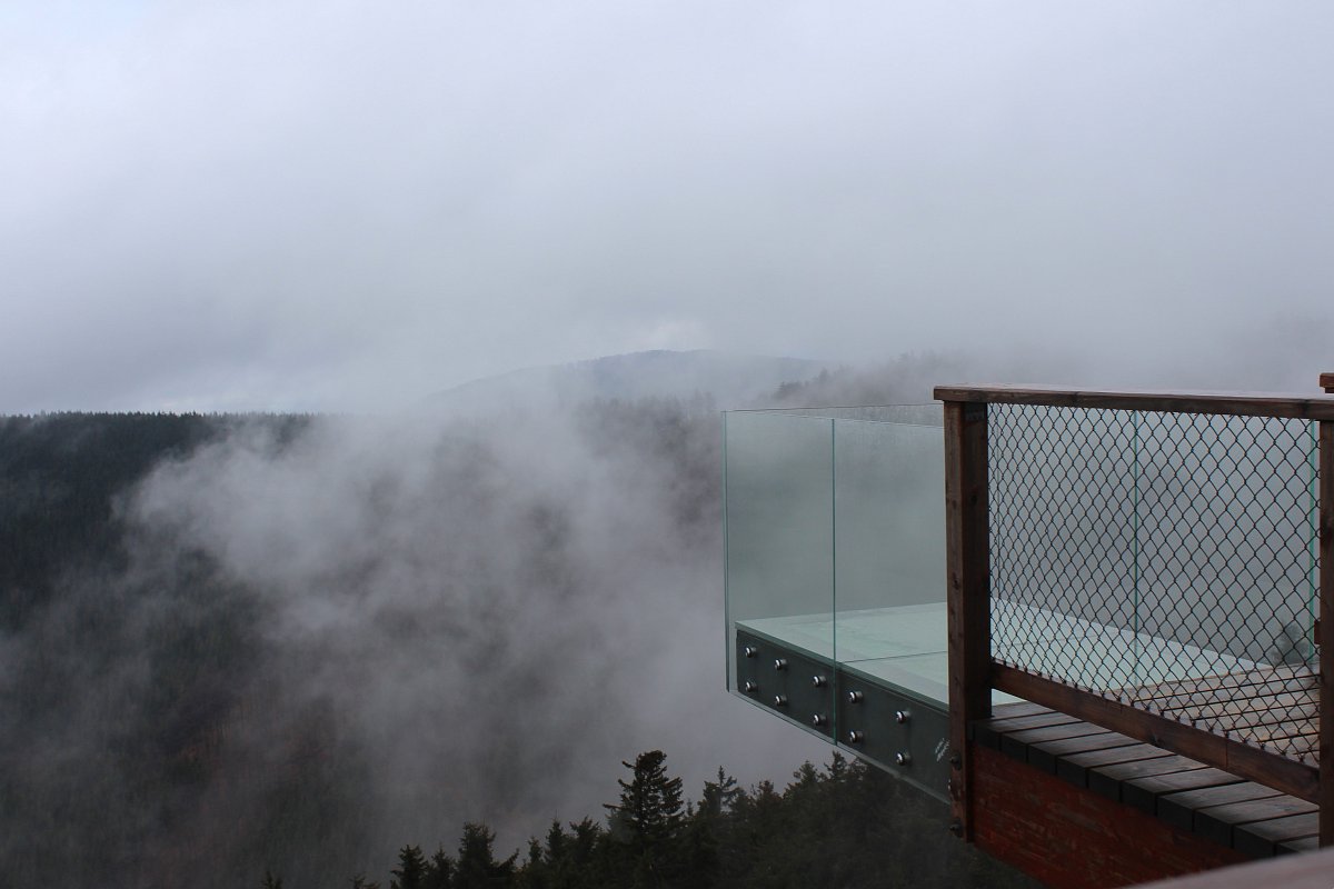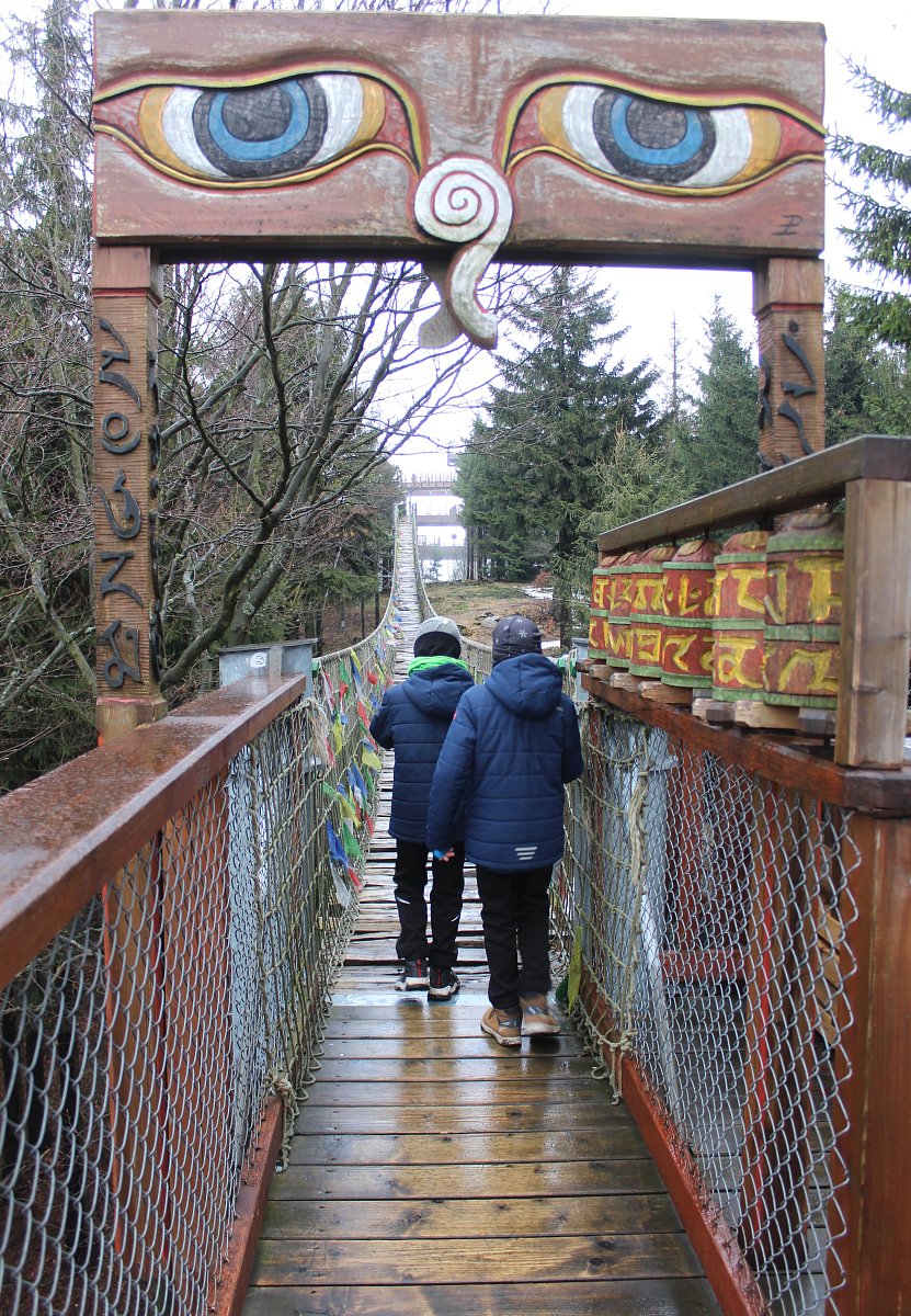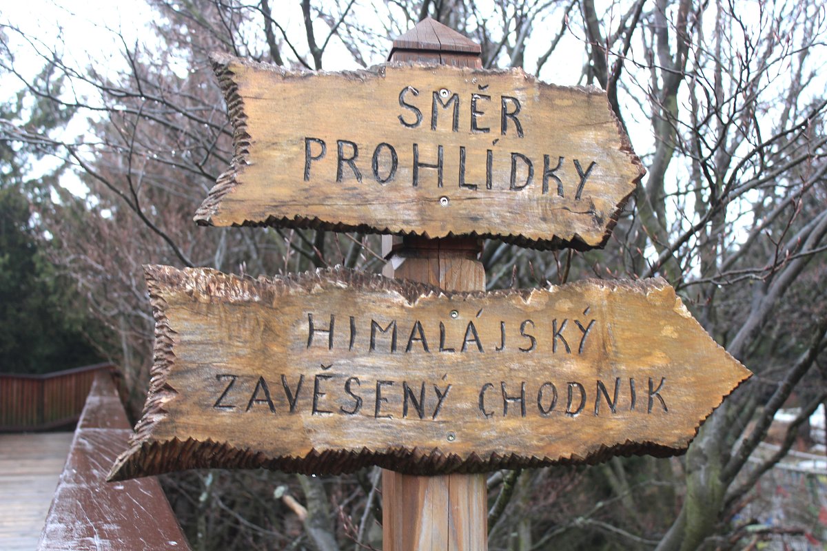 Venku přestalo pršet, tak jsme vyrazili vstříc zážitkům. Napřed jsme se trošku porozhlédli po okolí, a potom už naše kroky vedly ke slíbené stezce v korunách stromů. Slečna v pokladně nám nabídla výhodnější rodinnou vstupenku, a nám už nic nebránilo vystoupat vzhůru k oblakům. Docela to po dešti pod nohama klouzalo, ale měli jsme pořádné boty, tak jsme to dali. Horší to bylo na zavěšené houpavé himalájské cestě, ale i tu jsme zvládli. Úplně nahoře byla prosklená vyhlídka, tu dal ale jen jeden z nás, brácha  Andrej. Za odměnu za naši statečnost jsme dostali vizitky a razítka do cestovatelských deníčků.