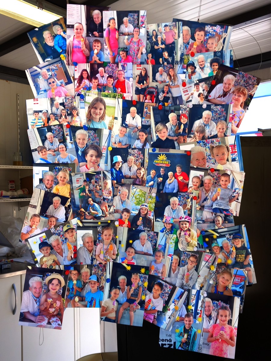 Malá Laura (3 roky) přišla a povídá: „Ahoj, jednu malou míchanou zmrzlinu a fotku prosím.“ Tatínek se na ni podíval a říká, že se vyfotí až se vrátí Teo od babičky. Laura se na něj podívala a smutně prohlásila, „Tak jo.“ Přišla Lucka, romská dívka s mladším bráškou. Lucka má 8 let „Můžeme se s vámi vyfotit? Denis má dnes narozeniny.“ Znám celou rodinu, nejstaršímu Igorovi je 15. A protože vloni maminka s focením souhlasila, tak jsem s tím neměla problém ani dnes. Fotografování se stalo zdejším hitem a mou nástěnku obdivují všichni zákazníci. Žádnému dítěti nedokáži focení odmítnout a každé dítě ode mě dostane také fotografii na památku. Fotit se chtějí i někteří dospělí a ani těm neodmítám. Někteří vloží fotografii s příspěvkem na mé Zmrzlinové FB stránky, „Zmrzlina u Dany“ kterou jsem vloni vytvořila, aby si mě lidé našli, když nás odstavili od hlavního vchodu Kauflandu až na konec parkoviště. Pomohlo to, a tak se vrací stálí zákazníci, a dokonce se hlásí i dospělí, kteří ke mně chodili třeba před 10 léty. Fotky s dospělými se během sezóny zamění s fotkami dětí. Nástěnka není obrovská, ale vejde se mi tam skoro 50 fotek. Jediný dospělý, který má právo být na nástěnce, je Honza Gavelčík z Radia Čas, kde nosím vždy na zahájení a zakončení sezóny zmrzlinu v termo boxech. Radim Bednář s Honzou si mě už párkrát odchytili a udělali se mnou rozhovor, což mi také pomohlo, že si mě lidé našli.