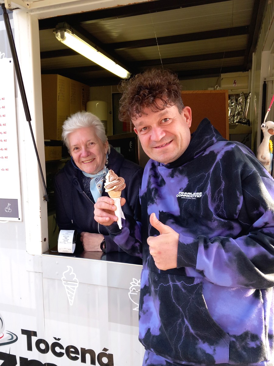 Dopoledne bývají děti ve škole, a tak se zastaví třeba maminky s malými dětmi. Ty jsou nejlepšími zákazníky. V mezičase budu koukat na kavky, které se bojí holubů, ale také straky, které to holubům vracejí. Dopravu, když známí projíždějí a zamávají, lidi, co chodí nakupovat do Kauflandu. Většinou se známe od vidění, tak se pozdravíme, prohodíme pár slov, a i zmrzlinu si koupí. A tak trochu bilancuji a říkám si, že to je to pravé, co mě těší, baví, a hlavně nabíjí energií. Nemyslím na nějaké zdravotní problémy a už vůbec si je nepřipouštím.
