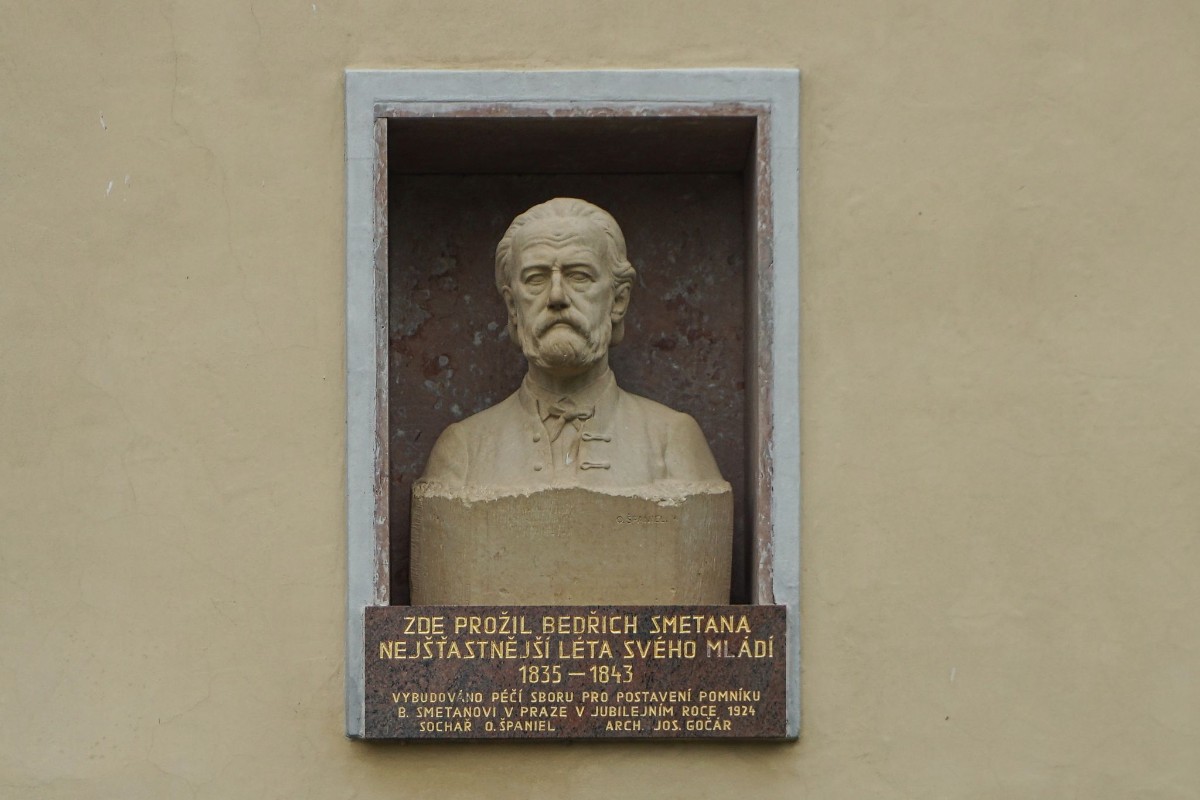 Z průčelí zámku shlíží na návštěvníky busta Bedřicha Smetany, kterou vytvořil Otakar Španiel podle návrhu Josefa Gočára.