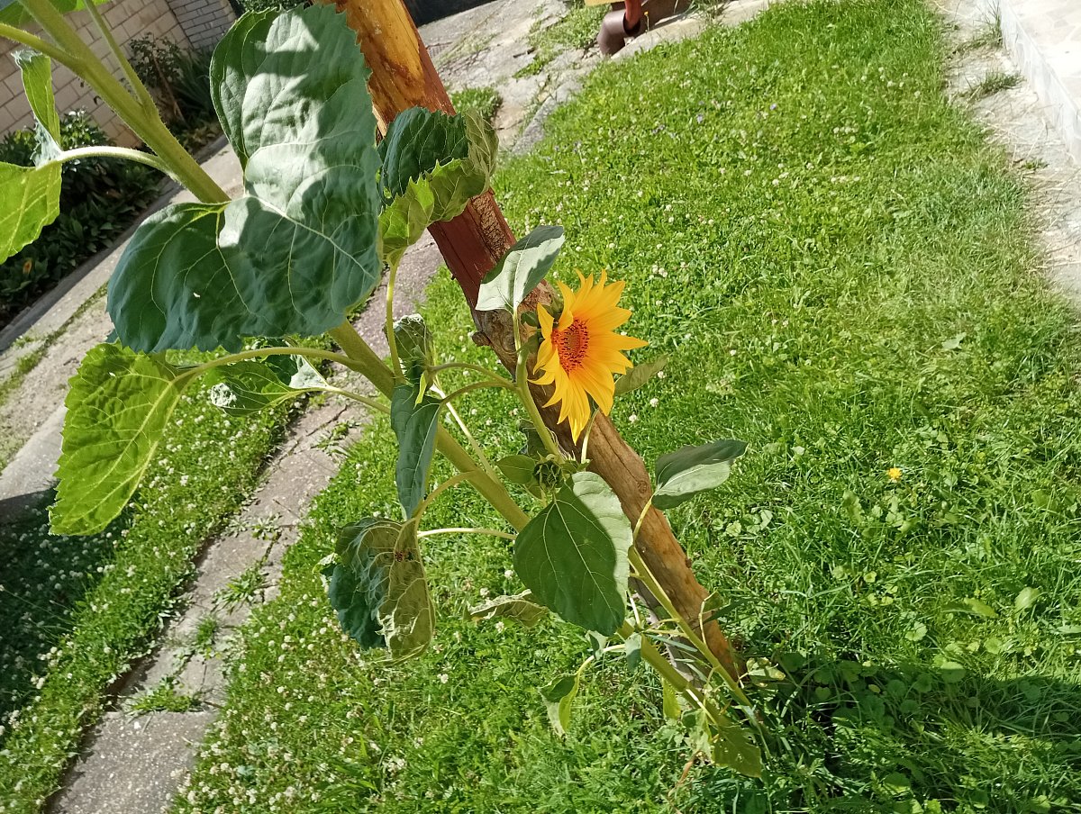 Ta fotka slunečnice je symbol mé snahy o dokončení vzhledu zábradlí. Vyrostly dvě pod krmítkem, do kterého v zimě sypu ptáčkům. Ta menší už kvete. Fotek jsem udělala asi deset, a některé byly rozhodně lepší, než tahle. Ale jen tahle jedna jediná po vložení k článku zůstala sice našišato, ale květem vzhůru. Na všech předešlých fotkách slunečnice buď leží nebo stojí na hlavě. Totiž na květu.