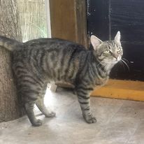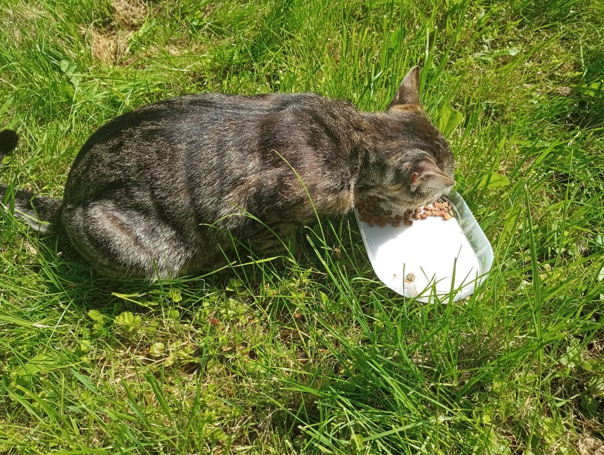 To není Bětka! Nejsem cvok a nemáme tu strašidlo, jen nešťastnou opuštěnou kočičku! A ona teď chodí po okolí, naříká a volá o pomoc. Nabrala jsem do mističky trochu granulí a odnesla je na horní zahradu. Kočka na mne čekala. Bylo na ní vidět, jak moc se bojí, ale když jsem zahrkala granulemi v misce a následně ji položila na zem, hlad byl silnější než strach. Vrhla se k misce a hladově hltala. Tak rychle žrát jsem kočku ještě neviděla. Za to jsem si stačila všimnout spousty klíšťat a lysých míst v jejím kožíšku – a také, že se nejedná o kočku, ale dobře vybaveného kocourka. Začala jsem mu říkat Tuláček. Pomalu se přestával bát, po dvou dnech na sebe nechal sáhnout, třetí den se mi podařilo dát mu za krk kapičky na venkovní parazity. Dojalo mne, když na mne zase jednou zavolal, počkal, až se mu ozvu (zřejmě je dobře vychovaný, bez pozvání na návštěvy nechodil), vynořil se z vysoké trávy na sousední zahradě, ... a pak sebou plácl na záda do trávy a ukázal mi bříško. Znalci vědí, že tak kočičáci dávají najevo, že vám věří. Trochu jsme se pomazlili, a až pak se zvedl a šel ke své misce. Chytil mne za srdce, a tak jsem ho nechtěla jen tak zanechat osudu. Začala jsem hledat řešení a Tuláčeka pomalu zvykala na kočičí přepravku. Dostával do ní krmení, granulky a kuřecí masíčko. Smála jsem se, jak rychle si zvykl. Vždycky se napřed ohlásil, abych věděla, že už je tu. Pak přelezl plot, vlezl do bedýnky, nažral se - a plácl sebou na terase pod růžičky. Užíval si siestu.