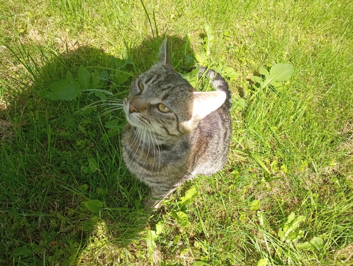 Tak si tak užíváme pohody, navzájem se špičkujeme, já mu ochutnávám pivo, jestli ho má dostatečně vychlazené, a do toho nám opět něco mňouklo. Tentokrát jsme oba viděli, kdo to je. Na zděné zídce vedle garáže stojí naše nejstarší kočka Bětka. Upřeně na nás zírá a hlasitě mňouká.