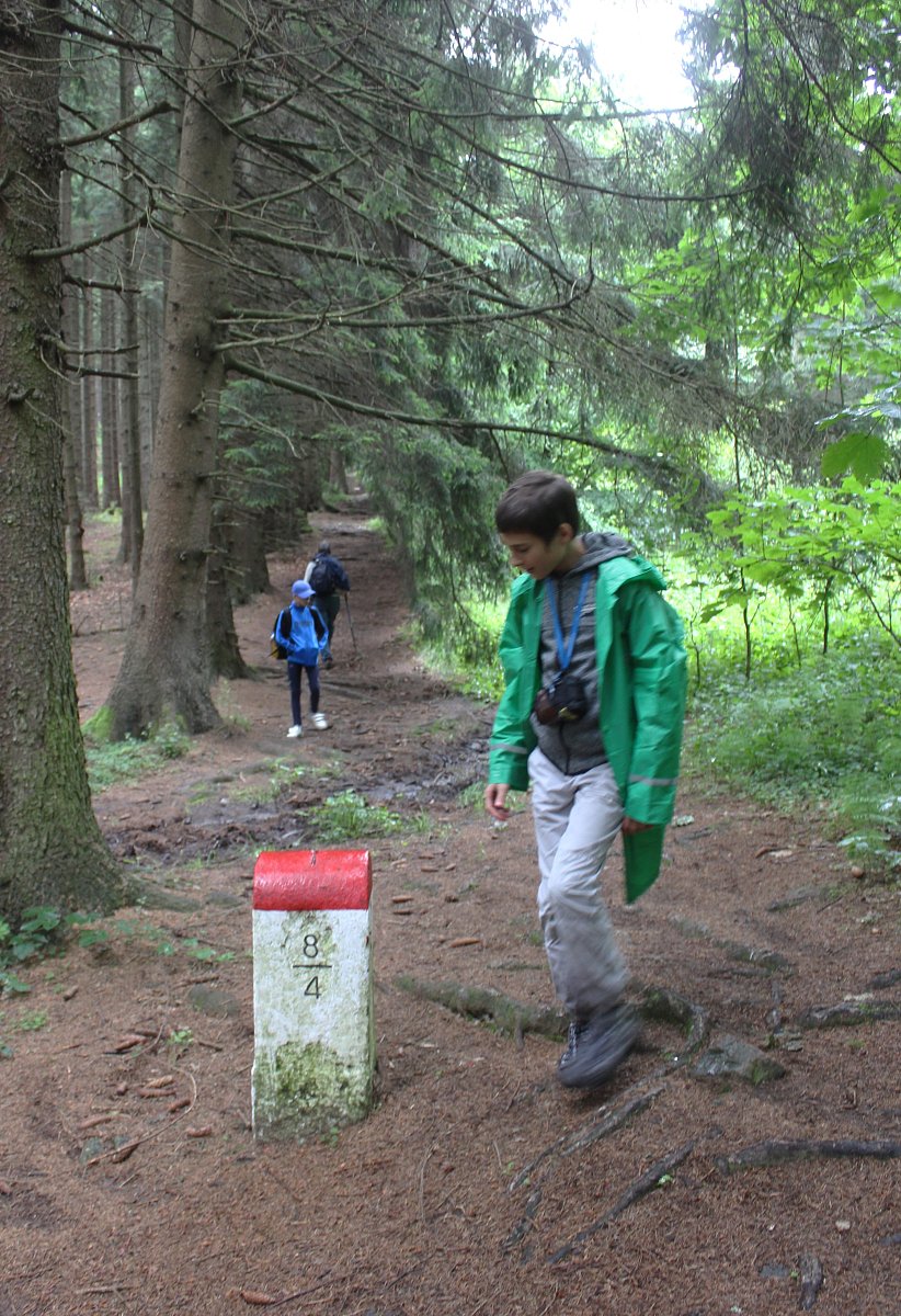 Potom už jsme se vydali po červené značce na 899 m vysokou Borůvkovou horu. Po prvním kilometru začalo docela hustě pršet. Za půl hodiny jsme měli úplně promočené boty. Počasí se ale, naštěstí, umoudřilo, a když jsme zvládli 3 km stezku po česko-polské hranici, začalo dokonce vykukovat sluníčko. Nahoře pod rozhlednou už hezky hřálo. Napřed jsme se pořádně posilnili, doplnili tekutiny a smlsli i nějakou sladkost. Vstup na rozhlednu byl zdarma. Vyšlapali jsme 155 schodů, a nakoukli jsme do Polska i k nám.