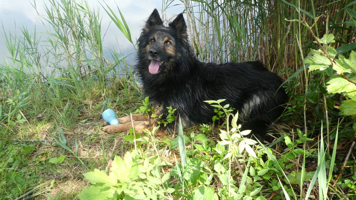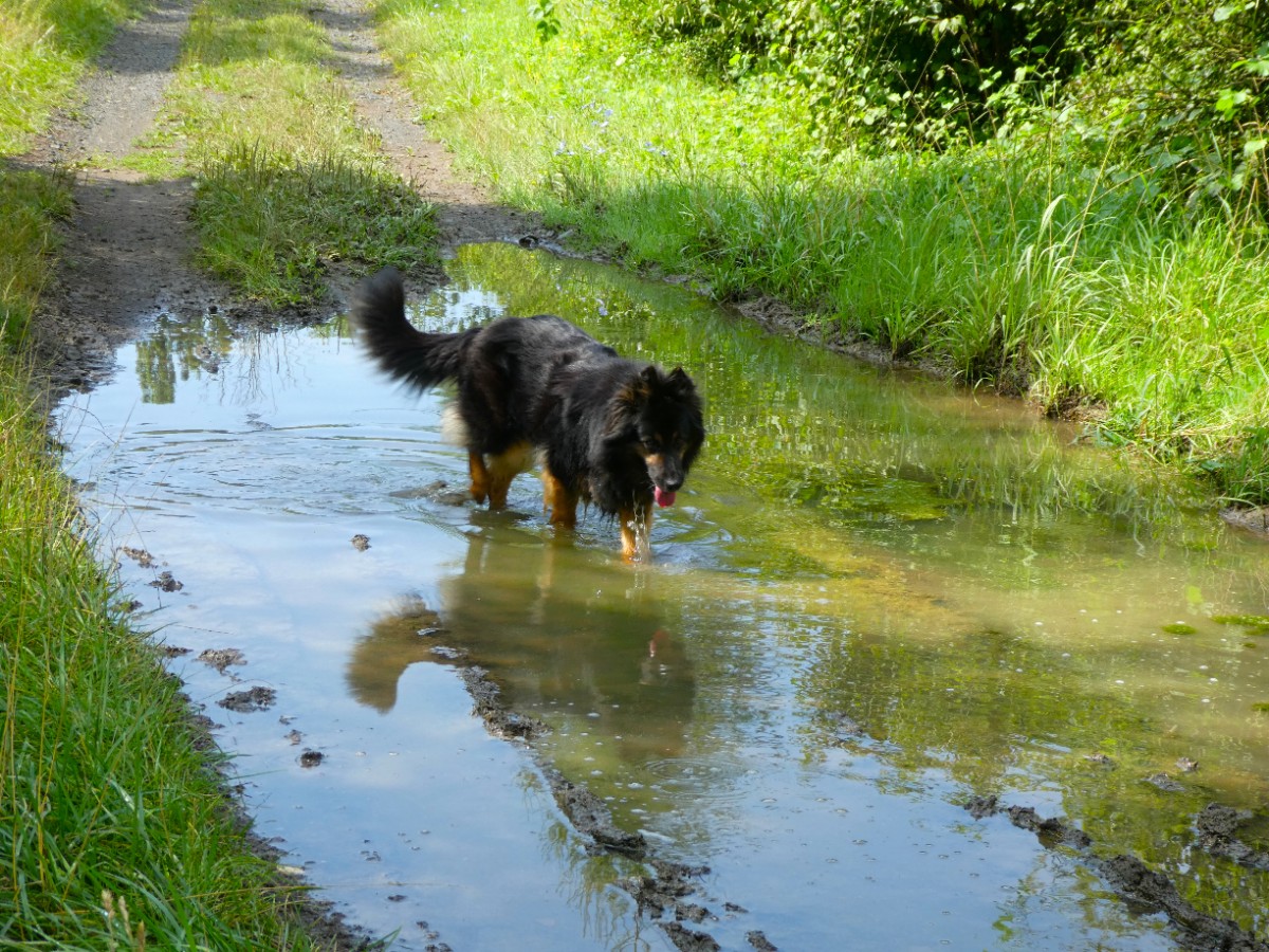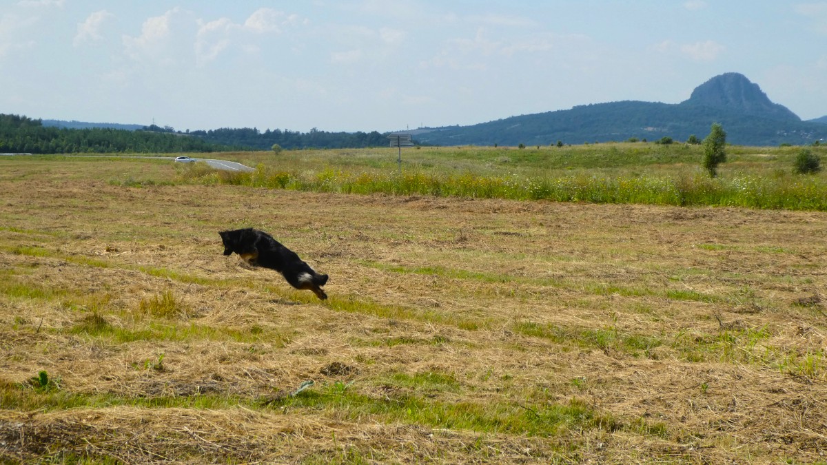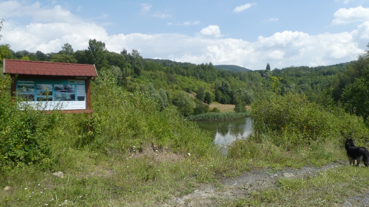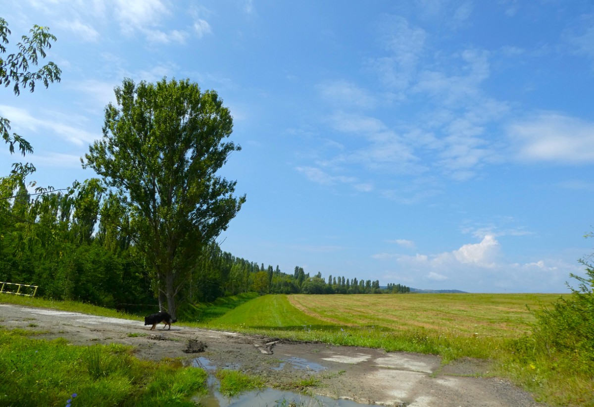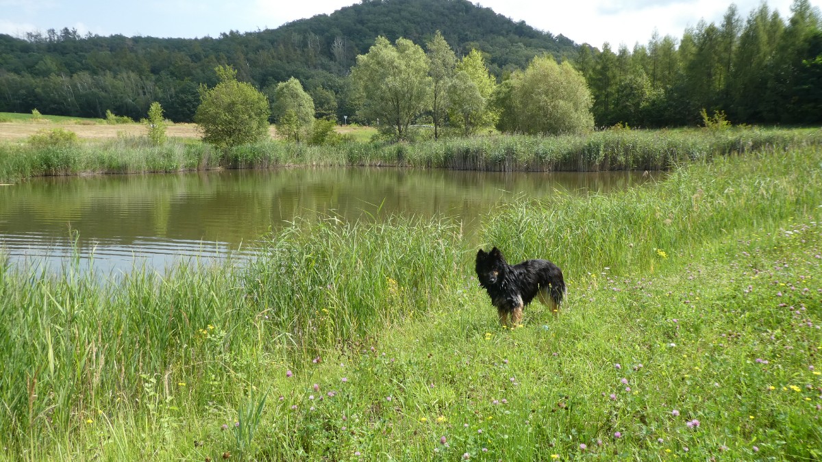 Vydala jsem se přes bývalé vesničky, dnes již zarostlé zelení, směrem  pod Kostomlaty. Kus jsem prošla po cyklostezce. Zajímavé je, že prý chodec nesmí na cyklostezku, ta je vyhražena pro kolaře. A tedy po silnici? Tak jsme ukázněně vyšlapovaly po cyklostezce a jak to šlo, jsme přešly na posekanou velkou louku, která nás zavedla až k rybníčku.Mezi rákosím kvetly lekníny. Mysty radostně plavala, vrhala se do vody za malým míčkem a čekala, že ji budu následovat. Jenže neměla jsem plavky. Vždyť jsem nic neplánovala. Na zpáteční cestě se Mysty vydováděla a do každé myší díry strkala čumák.