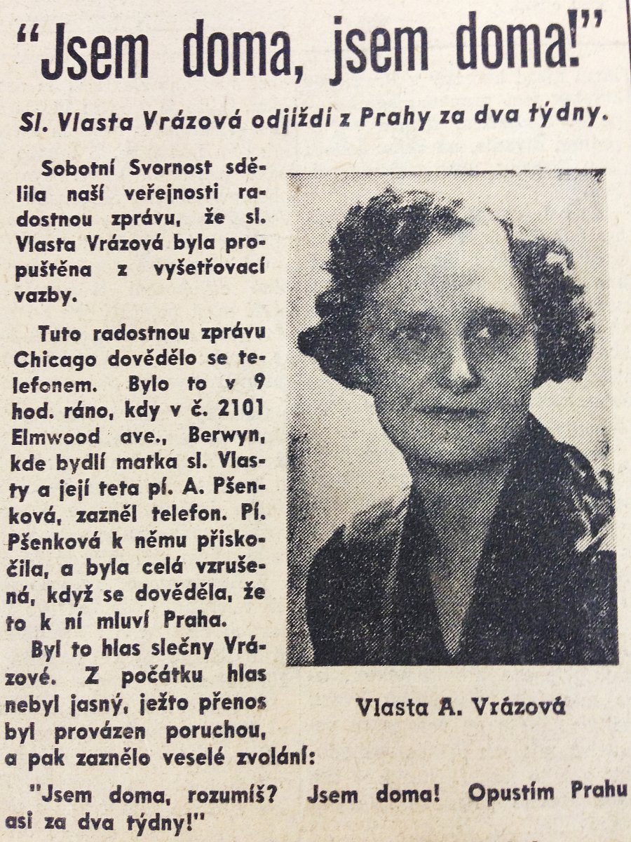 Československá národní rada americká (Czechoslovak National Council of America), nejvýznamnější krajanská organizace s 250 000 členy po celých Spojených státech, se vydatně zapojila do protinacistického odboje. Vlasta Vrázová patřila mezi její nejaktivnější pracovnice a postupně se vypracovala až do funkce předsedkyně Rady, zároveň skoro čtyřicet let redigovala její tiskové orgány, měsíčníky Věstník a American Bulletin. Avšak vraťme se zpět. Po skončení druhé světové války nastala nová významná kapitola života Vrázové. 12. října 1945 přicestovala do Prahy jako manažerka organizace American Relief for Czechoslovakia (ARC), jež zprostředkovala distribuci humanitární a materiální pomoci z USA do poválečného Československa. ARC fungovala jako jedna z divizí National War Fund, zřízeného v lednu 1943 Rooseveltovou vládou pro podporu spojeneckým zemím. Předsedou správní rady ARC, který stál za úspěchem většiny jednání s americkými donory, byl Kenneth D. Miller, humanitární pracovník, činitel presbyteriánské církve, který procestoval české země již v roce 1912 a mimochodem patřil k největším světovým sběratelům československých poštovních známek vůbec. Vrázová měla na starosti rozdělování zásilek konkrétním příjemcům. Ač Československo nebylo poničeno tak jako jiné země, sociální situace a zdravotní stav obyvatel pochopitelně měly k ideálu daleko. Především děti trpěly nízkým denním přísunem kalorií a podvýživou, alarmujícím způsobem se zvyšovalo množství nakažených tuberkulózou. Nemocí bylo ohroženo až 18 000 dětí. ARC s ročním rozpočtem okolo milionu dolarů přijímala dary ze sbírek nejrůznějších církevních a dobročinných organizací, od mecenášů i krajanských spolků, a nakupovala šatstvo, léky, potraviny, nejmodernější rentgenové přístroje a jiné převážně nemocniční vybavení. Vše probíhalo ve spolupráci s pražským ministerstvem sociální péče, které hradilo lodní transport z New Yorku do Brém či Hamburku, a odtud pak převoz po železnici až do Prahy, především do centrálního překladiště na Žižkově. Jen potravin dopravila ARC v průběhu roku 1946 přes 800 tun. Vrázová ze sídla ústředí v hotelu Alcron ve Štěpánské ulici komunikovala s nemocnicemi, školami, dětskými domovy a ústavy, podnikala inspekční cesty i do nejzapadlejších koutů republiky, zpopularizovala vysílání Hlasu Ameriky, pro který často natáčela reportáže.