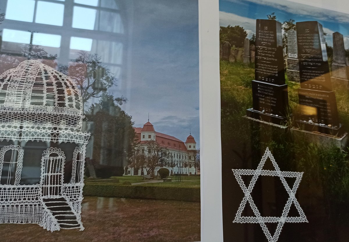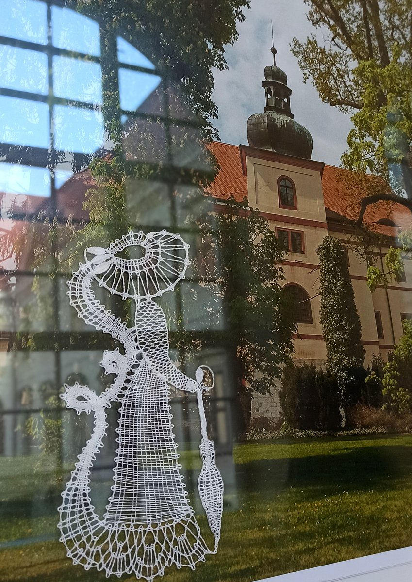 Hodně nás ale zaujala nová výstava "Souznění paličkované krajky a fotografie" od manželů Olgy a Jana Kurzových. On fotografuje hrady, zámky a jiné památky. Ona je doplňuje krásnými paličkovanými krajkami. Výstava potrvá do 31.10.2024.