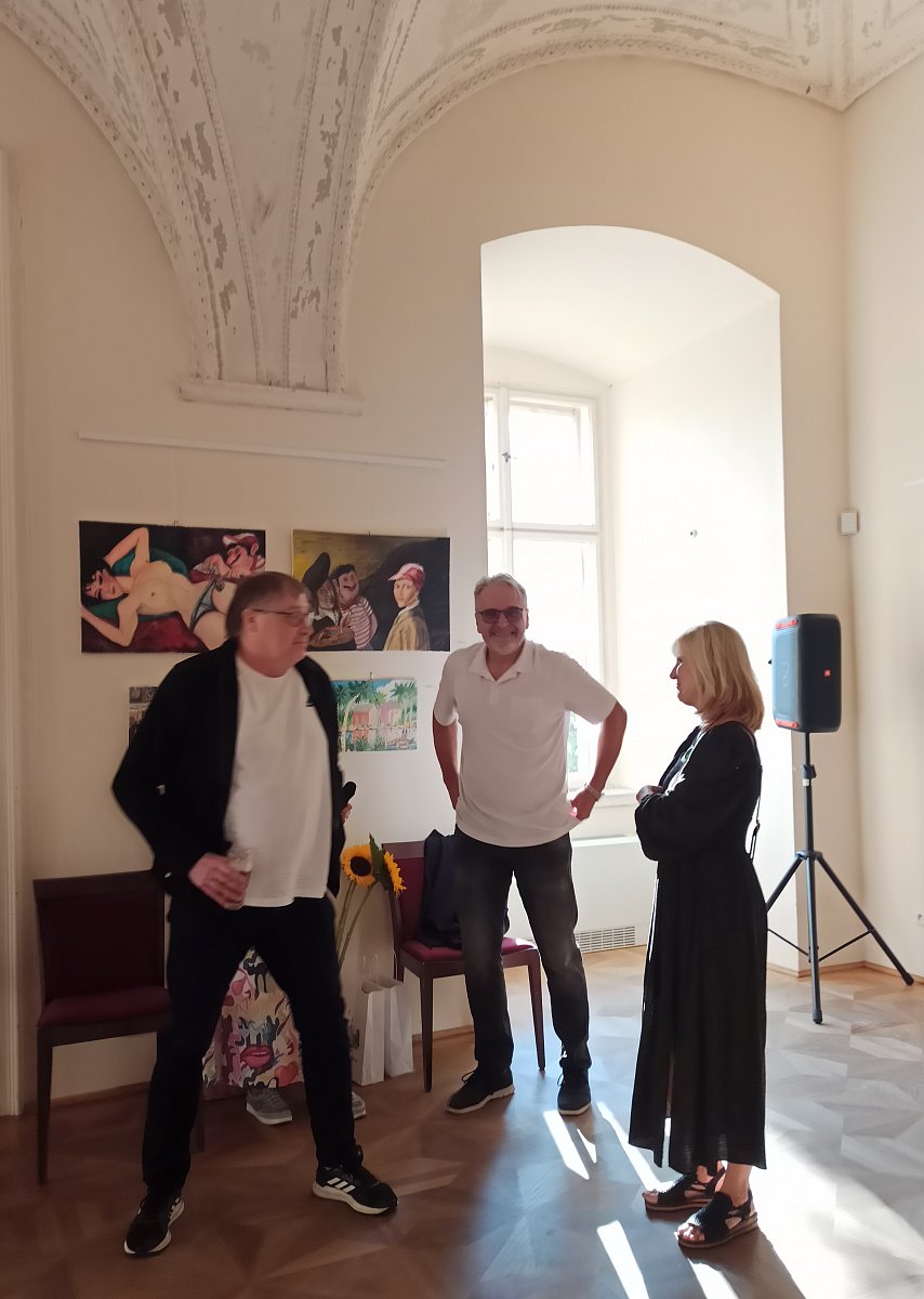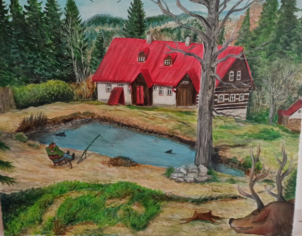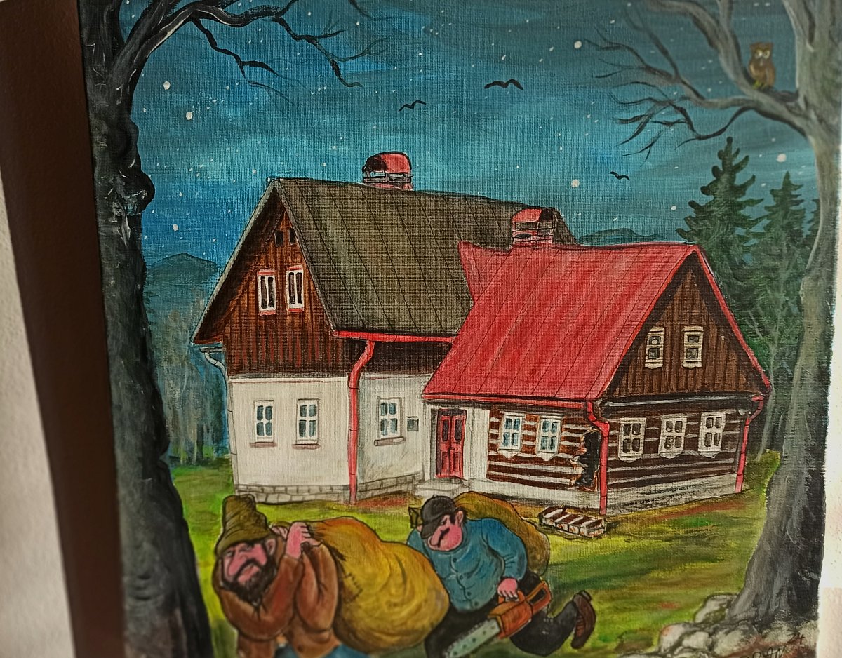 Jeho humor je na mě trošku drsný, ale obrázky se mi moc líbily, hlavně kouzelné chaloupky. Sám mistr je moc příjemný a vstřícný. S manželem si povyprávěli o malířských technikách, a mě dokonce vysekl poklonu, když prohlásil, že ze mě vyzařuje tolik pozitivní energie, kterou můžu předávat i ostatním. Proto ji posílám prostřednictvím svých fotografií všem, kteří ji v těchto dnech potřebují.