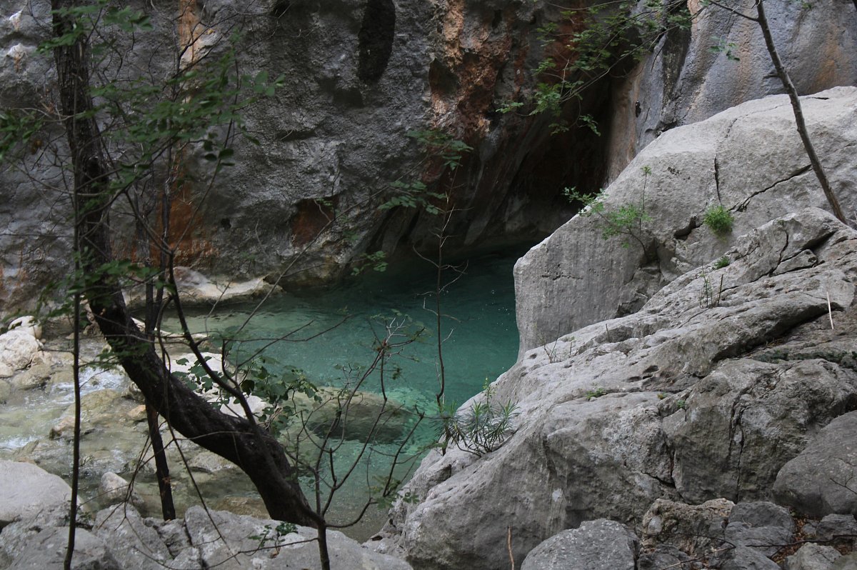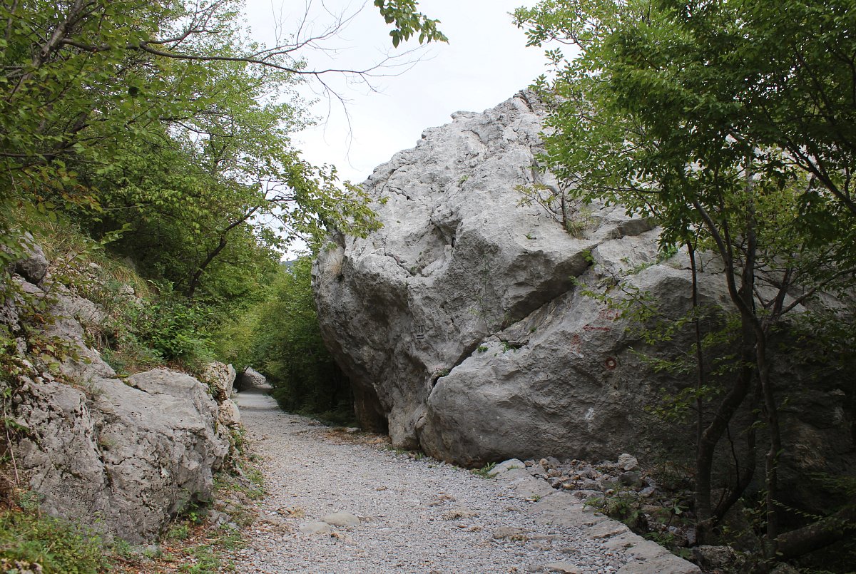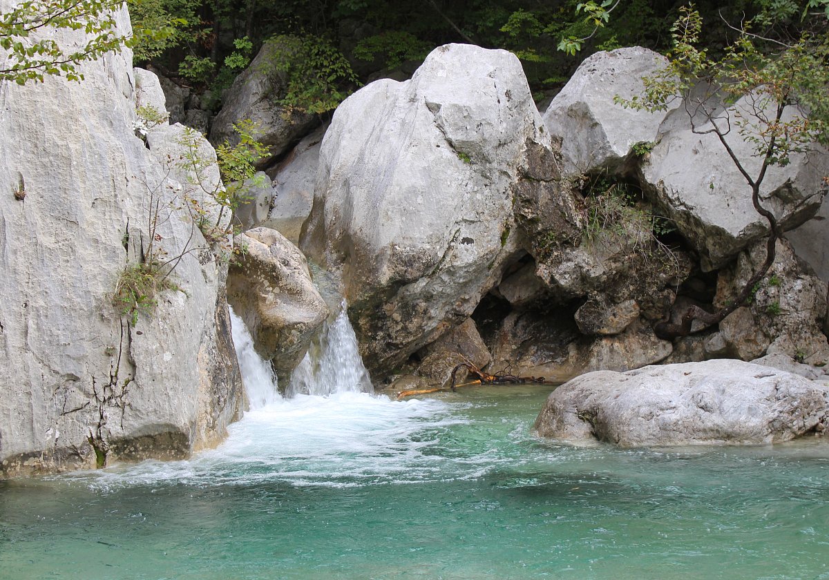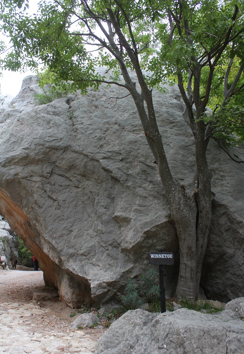 V kaňovu jsme viděli cedule s upozorněním, že tam němečtí filmaři v minulém století natáčeli slavnou indiánku o apačském náčelníkovi Vinnetuovi. Scenérie byly moc hezké. Modrá voda v říčce valící se přes bílé kameny. Listí na stromech bylo ještě zelené, jen nahoře v horách už bylo zbarvené do podzimních barev.