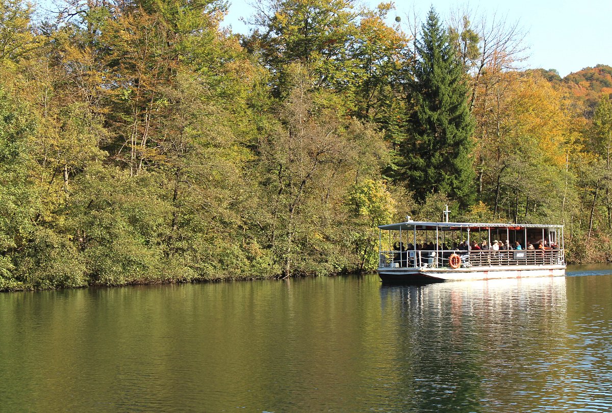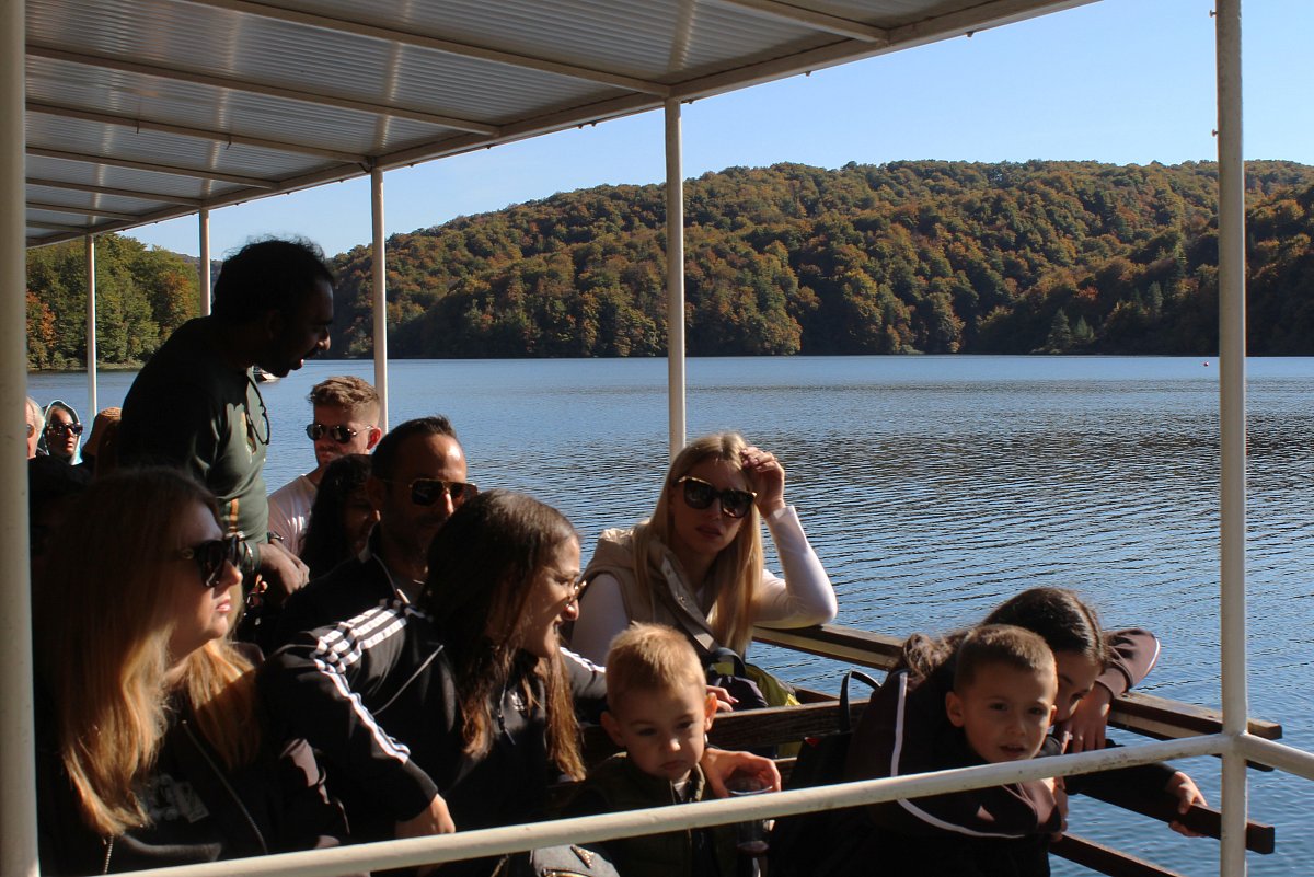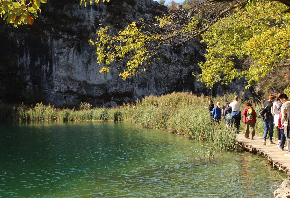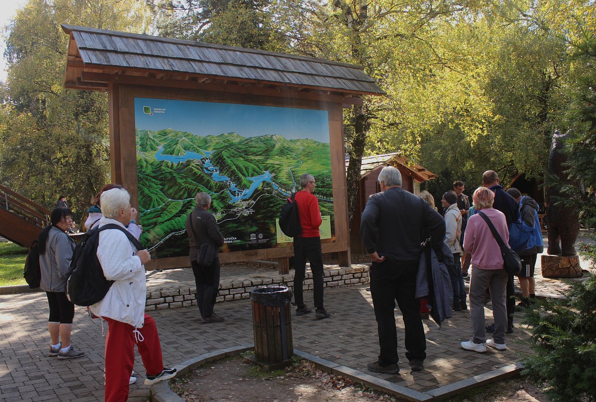Procházku jsme začali na parkovišti u velké přehledné mapy. Náš průvodce pan Aleš nám popsal asi 4 hodinovou cestu okolo jezer. Před námi byla cesta se 150 metry převýšení, plavba lodí přes největší jezero a cesta vláčkem zpět od toho nejvyššího. Podzimní příroda hrála krásnými barvami, voda v některých jezerech byla hezky zelená a slunce se odráželo od vodní hladiny. Potkávali jsme skupiny návštěvníků z celého světa, z Evropy i z Asie.
