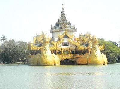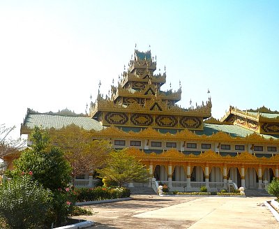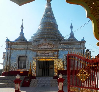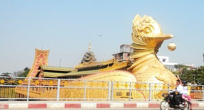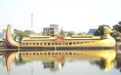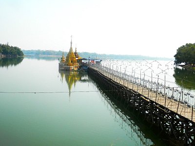 Obědváme ve městě Mektila, které leží na břehu stejnojmenného jezera. Mezi silničním a železničním mostem západně od centra města nás oslnil pohled na chrám Phaung Daw U Paya, který se nachází v obřím plovoucím člunu ve tvaru bájného zlatého ptáka.
