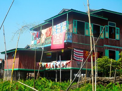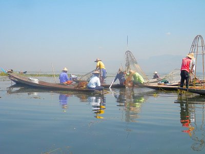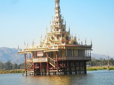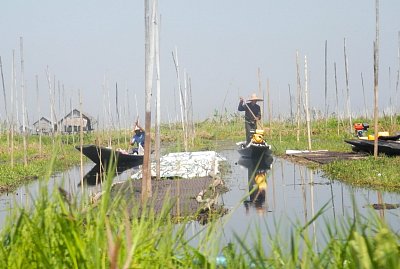 Na jezeře Inle jsme se první noc ubytovali blízko břehu. Zdálo se to výhodné, ale brzy jsme pochopili náš omyl. Celý den a do pozdní noci bylo slyšet burácení motorů lodí a člunů z jezera. Některé z nich vozily turisty, jiné patřily lidem z etnické skupiny Intha, kteří žijí v plovoucích vesnicích postavených na hromadách rákosu a jiné vegetace. Přímo na jezeře a v jeho okolí se nachází několik chrámů a pagod. Zajímavé jsou rovněž plovoucí zahrady, kde se pěstují rajčata, lilky, zázvor a další rostliny.