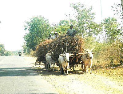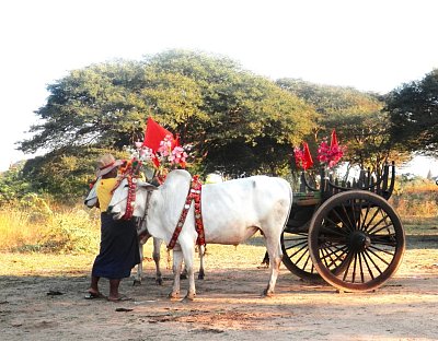 Jsme znovu na cestě, míjíme tradiční myanmarské povozy.