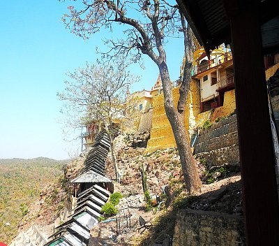 Popa je spící sopka s nadmořskou výškou 1518 metrů, která se stala významným poutním místem buddhistů. Nachází se tam několik chrámů a svatyní nátů. Natové jsou duchové uctívaní v kultuře Myanmaru. Na vrcholu hory vyniká překrásná svatyně Taung Kalat, kterou zdobí zlaté stúpy. Je odtud úchvatný výhled do okolní krajiny. Ale pozor! Kdo chce toto všechno vidět a zažít, musí nejprve zdolat 777 schodů. Naboso a beze strachu z opic, které na poutníky někdy až příliš troufale skáčí. Schody jsou příkré, špinavé, rozpálené a mají ostré ocelové hrany. Nemohoucí poutníky vynášejí najatí nosiči. Já jsem to vzdala. Manžel má sice obě kyčle umělé, ale neumí si představit, že tam nevystoupá. Já mu budu vděčná za fotky a vyprávění. Skutečně tam vylezl. Vzpíral se na zábradlí, aby šetřil kyčle. Vyhýbal se poutníkům v protisměru a uvolňoval průchod mladším. Vytrvale fotil, takže jako bych tam byla.