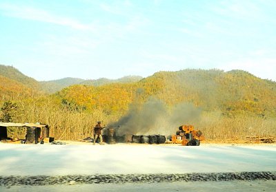 Po obědě pokračujeme dále do města Kalaw. Cestou sledujeme stavbu silnice. Dělníci nemají žádné ochranné pracovní pomůcky, holýma rukama manipulují s vroucím asfaltem a vdechují jeho škodlivé páry. Jiná skupina kladivy drtí kameny, které budou použity na podklad pod asfalt.