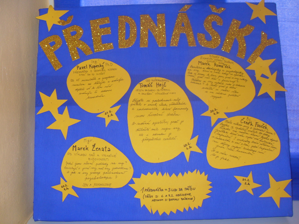 Na gymnáziu v Boskovicích proběhl minulý týden Studentský Salon. Tato celotýdenní akce má dlouholetou tradici - letos už 36. ročník - pořadatelská třída septimy si zvolila velmi zajímavé téma a to "SNY".