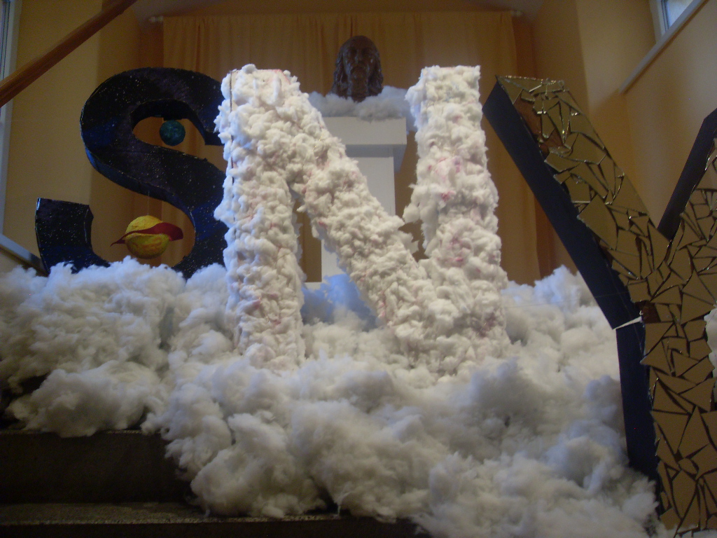 K výzdobě bylo využito mnoho vlastnoručně vyrobených ozdob, studenti septimy celý týden jarních prázdnin věnovali právě přípravě a náročné výzdobě celé školy.