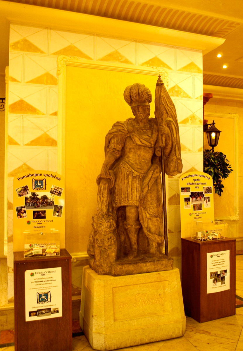 Historizujícím průčelím z Růžové ulice vstoupíte do pasáže, která je průchozí směrem k zimnímu stadionu. Vpravo vás přivítá socha sv. Floriána s pokladničkami charitativních sbírek. Dominantou výjimečného interiéru pasáže je však unikátní vodní fontána s nepřekonatelnou aqua show, která zde byla nainstalována jako teprve druhá svého druhu v Evropě.
