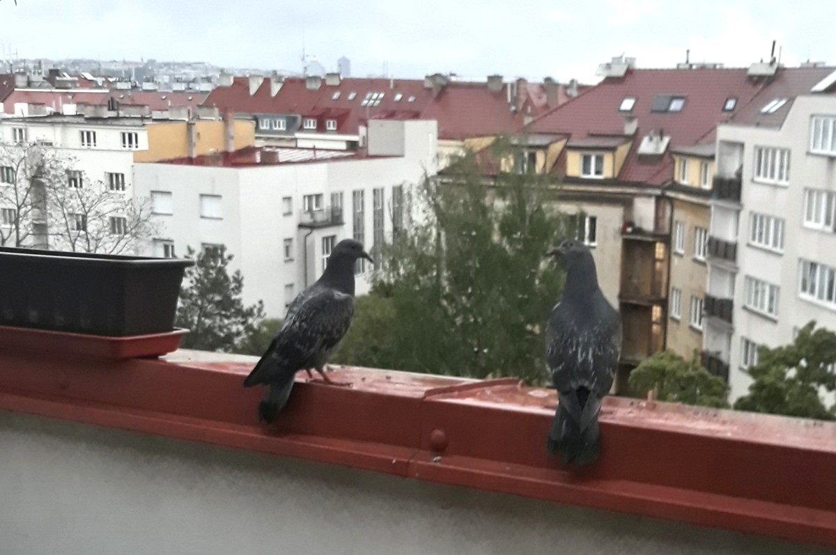 Ráno 24.4.2025 jsem se probudil a jako obvykle jsem se šel podívat, co je nového s holoubaty. A uviděl jsem, že v 6:40 už sedí na parapetu obě holoubata, takže vzlétlo po 30 dnech od vylíhnutí už i to menší holoubě (holubička). Přestože dost pršelo, společně obě holoubata zvědavě zkoumala okolní střechy (obr. 37 až 41). A to už v pravidelném čase přiletěl holub rodič na terasu krmit a holoubata nikde (obr. 42)! Tak jsem na stolek na terase nasypal trošku zrní a netrvalo dlouho a k holubovi rodiči přiletěla i obě holoubata. Pak se k nim přidala i holubice a společně chvíli pózovali na terase a parapetu, aby následně definitivně všichni odlétli neznámo kam (obr. 43 až 46).