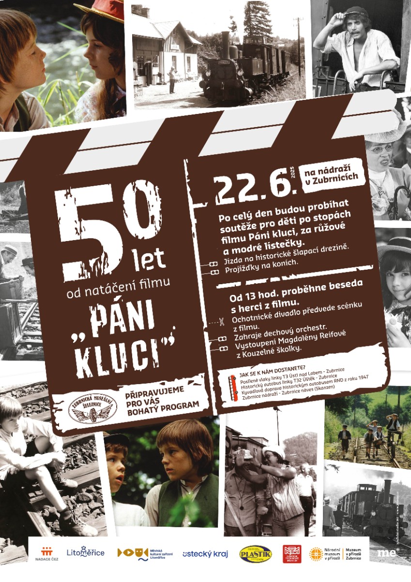 Je to až neuvěřitelné, ale přesně před 50 lety se natáčel legendární, snad všemi generacemi známý a oblíbený filmový snímek režisérky Věry Plívové-Šimkové Páni kluci, ve kterém zazářili v dětských rolích Magdalena Reifová a Michal Dymek. Při této příležitosti se uskuteční 22. června 2025 na nádraží v Zubrnicích celodenní oslavy za účasti některých herců.